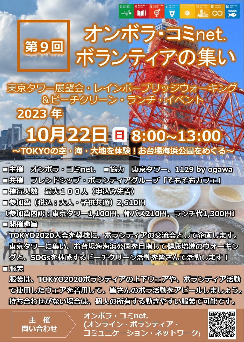 TOKYO2020大会を契機に、ボランティアの交流会として企画します。東京タワーに集い、お台場海海浜公園を目指して健康増進のウォーキングと、SDGsを体感するビーチクリーン活動を皆さんで活動します!オープン前の東京タワーを貸切り、東京の街を展望します!