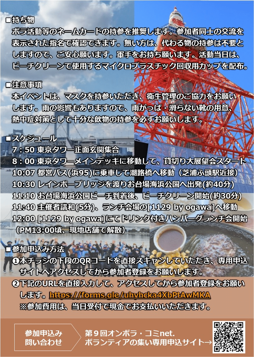 ■主催 オンボラ・コミnet. ■協力 東京タワー、1129 by ogawa ■共催 フレンドシップ・ボランティアグループ「そもそもカフェ」■催行人数 最大40人(申込み先着)■参加費(税込:大人・子供共通)2,610円〔参加費内訳:東京タワー1,100円、都バス210円、ランチ代1,300円〕
