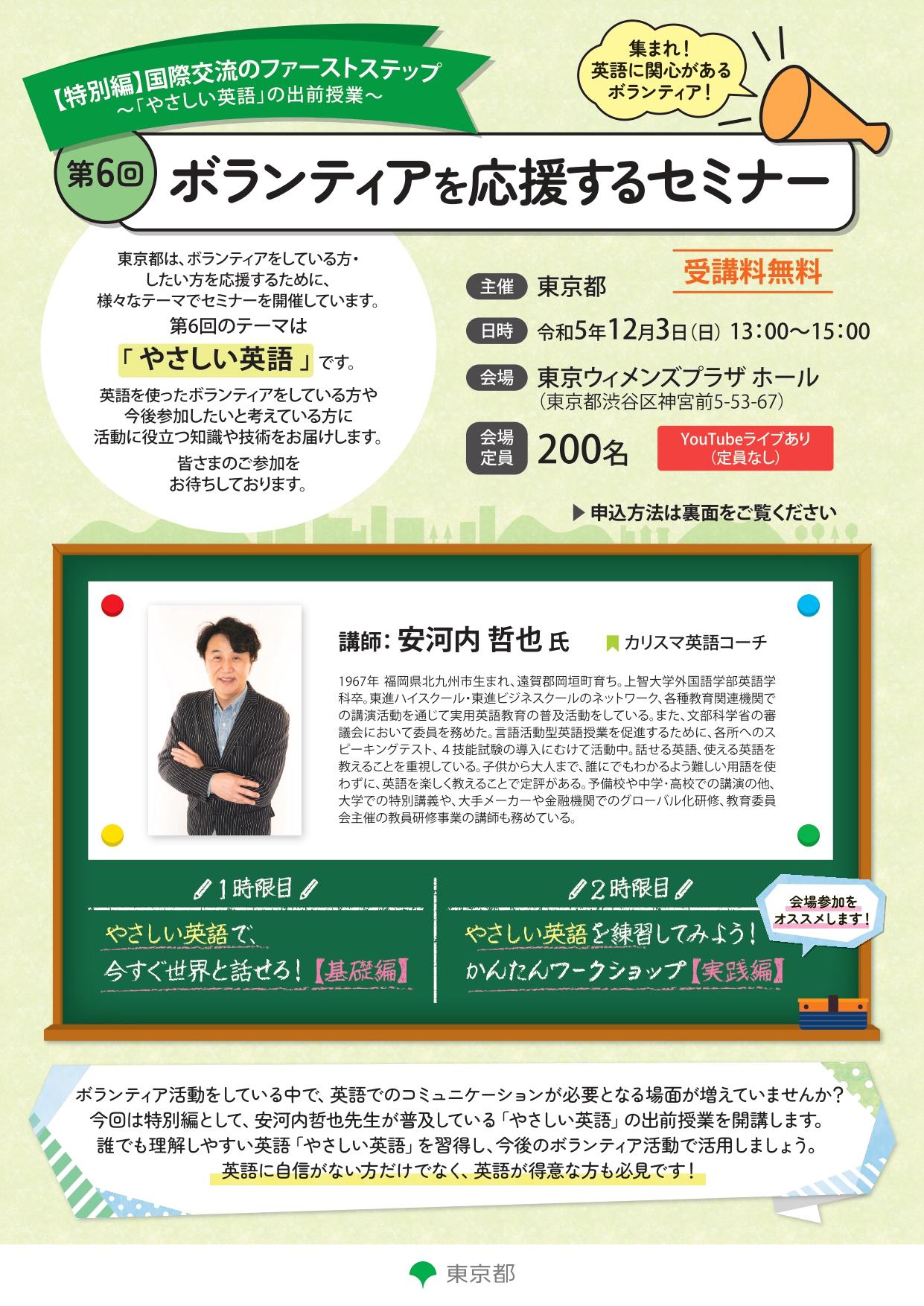 東京都は、みなさまのボランティア活動を後押しする「ボランティアを応援するセミナー」を実施しています。今回は特別編として、「やさしい英語」をテーマに開催いたします!