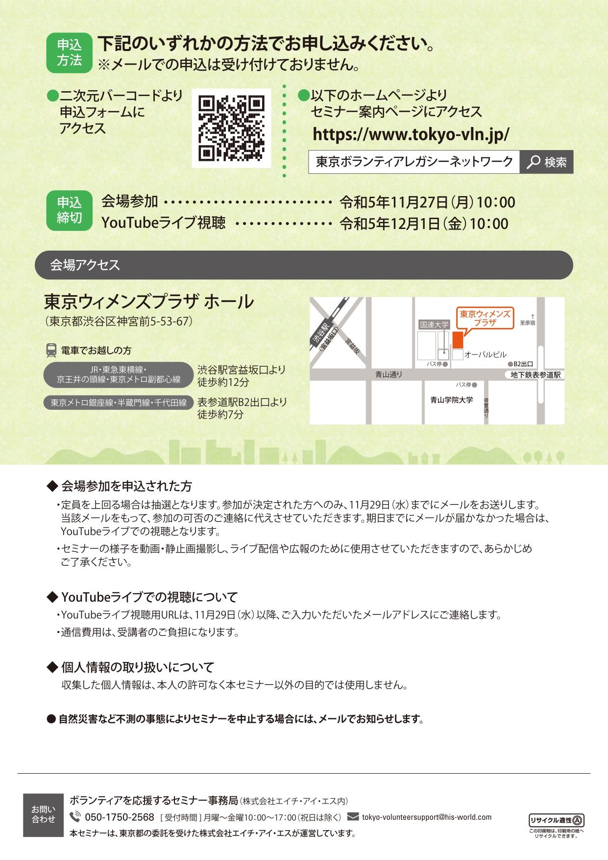- ボランティアを応援するセミナー事務局(株式会社エイチ・アイ・エス内) TEL:050-1750-2568(受付時間 月曜~金曜 10:00~17:00 祝日は除く) E-MAIL:tokyo-volunteersupport@his-world.com