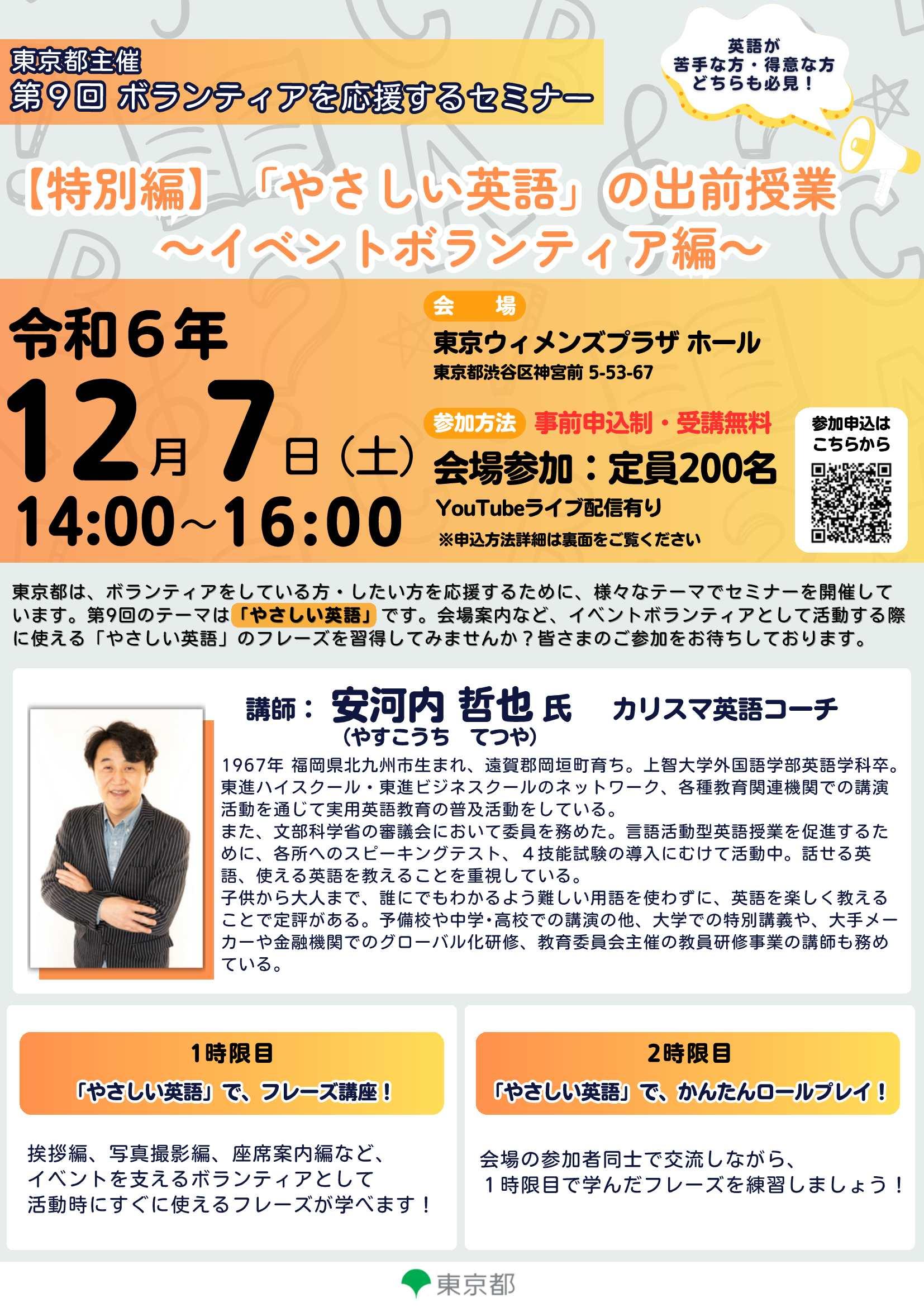 東京都は、みなさまのボランティア活動を後押しするために、様々なテーマで「ボランティアを応援するセミナー」を開催しています。第9回は「やさしい英語」をテーマに、12月7日(土)に開催します!