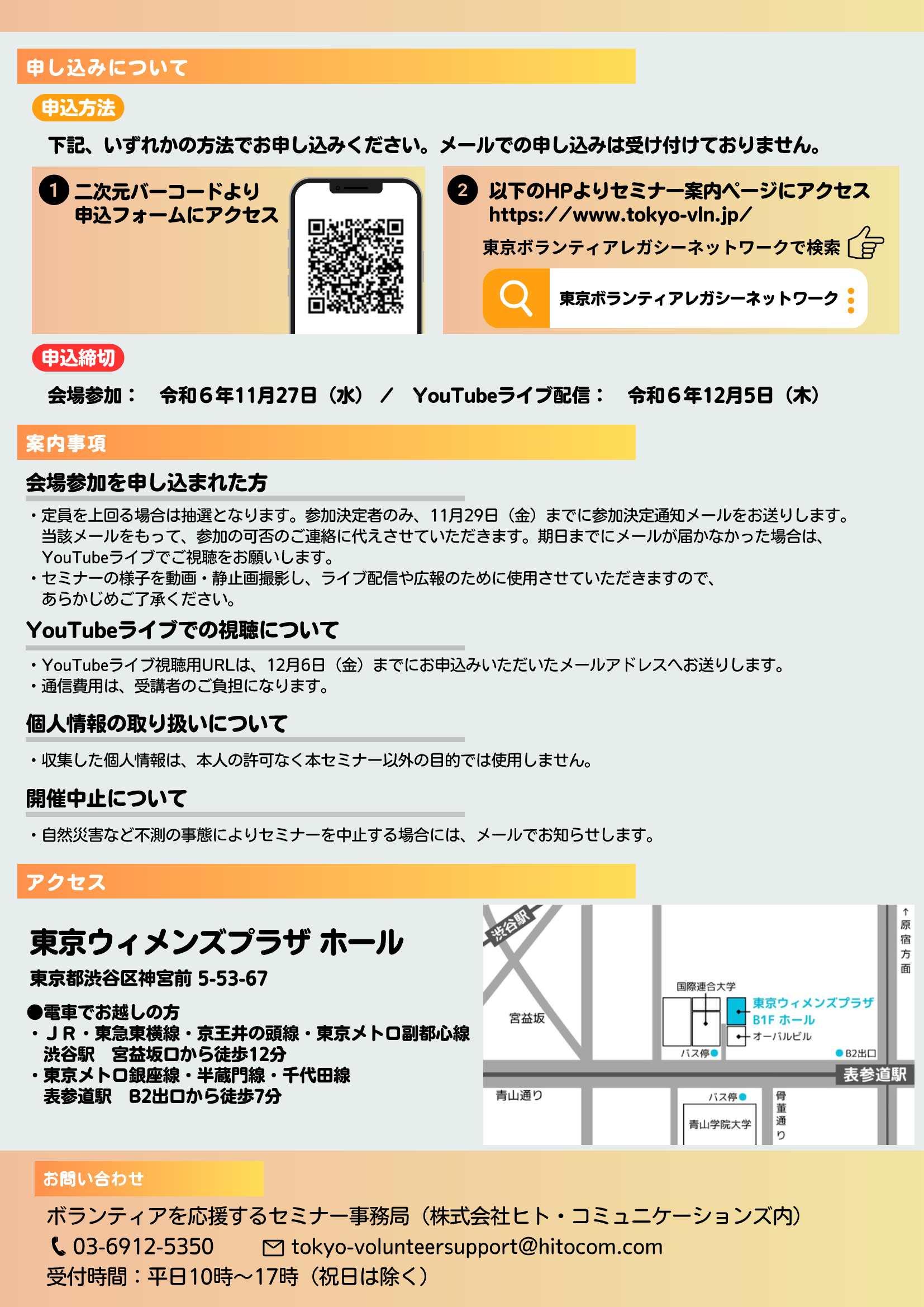 - ボランティアを応援するセミナー事務局(株式会社ヒト・コミュニケーションズ内) TEL:03-6912-5350(受付時間 月曜~金曜 10:00~17:00 祝日は除く) E-MAIL:tokyo-volunteersupport@hitocom.com