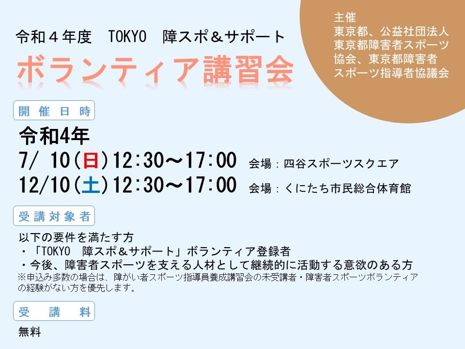 - 受講対象者は、「TOKYO 障スポ&サポート」ボランティア登録者のうち、障害者スポーツボランティアの経験がない方で、かつ、今後、障害者スポーツを支える人材として継続的に活動する意欲のある方