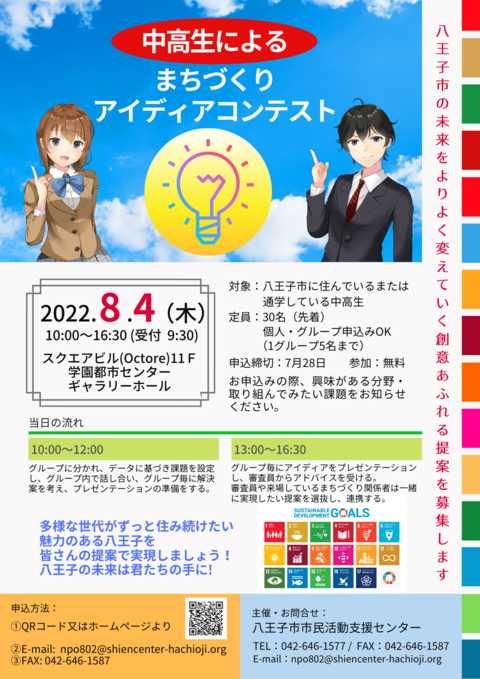 様々な世代が住みやすく、楽しい未来の八王子を実現するため、中高生のみなさんに是非アイディアを提案してほしい!