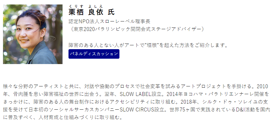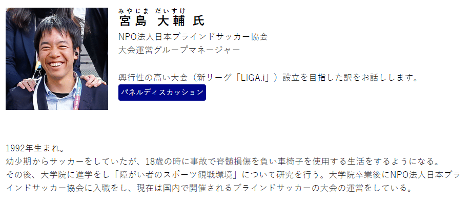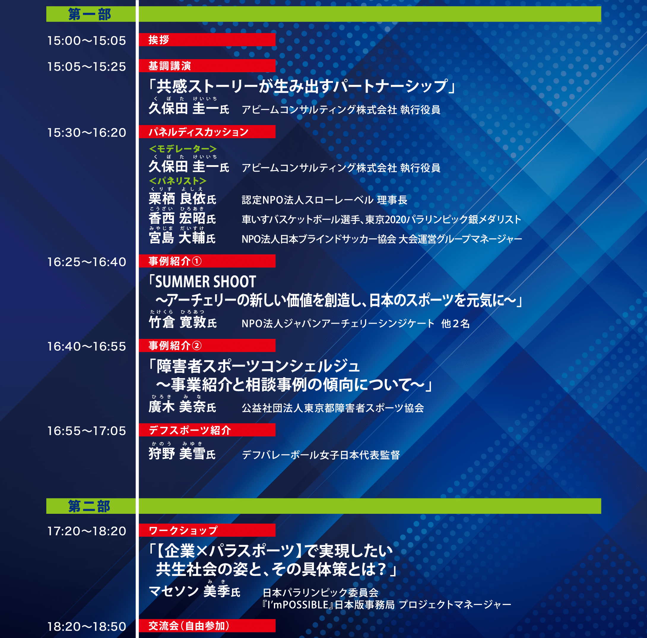 パラスポーツ振興に興味・関心のある皆さまに向けて、パラリンピアンや競技団体関係者、コンサルタント等を招いたカンファレンスを開催します。今回は、パラスポーツや障害を通じた様々なエピソードを基に、パネルディスカッション等を行います。どなたでもご参加いただけますので、お気軽にお申込ください!【日時】
