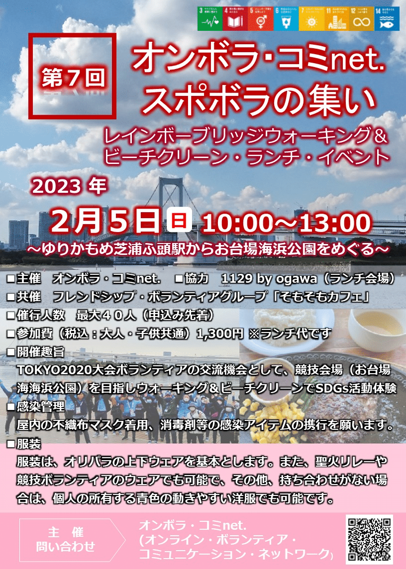 第7回オンボラ・コミnet. スポボラの集いの開催です!毎月開催している幕張ビーチクリーンに追加して、新たに東京のお台場での活動が12月からスタートしました。スポボラの集いとして、お台場では2回目。お台場でのビーチクリーンは3回目の活動となります。
