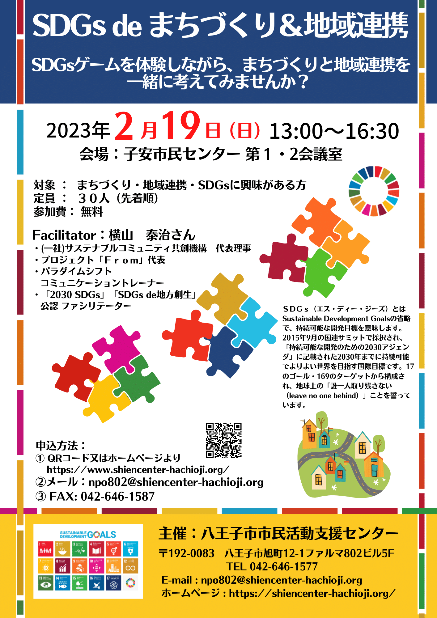 - 八王子市市民活動支援センター TEL: 042-646-1577 Mail: npo802@shiencenter-hachioji.org