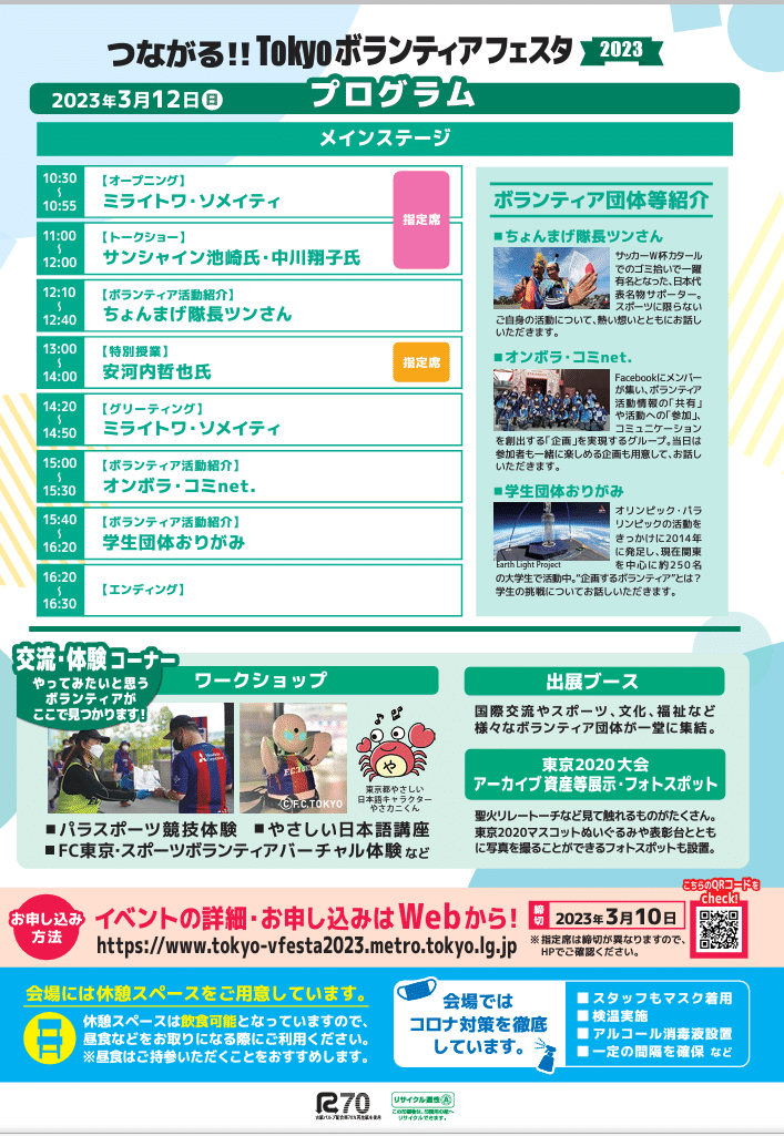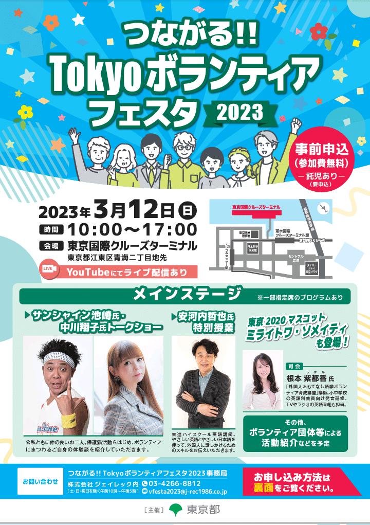 詳しくは、「東京都主催『つながる!! Tokyoボランティアフェスタ2023』」をご確認ください。 皆様のご参加をお待ちしています!