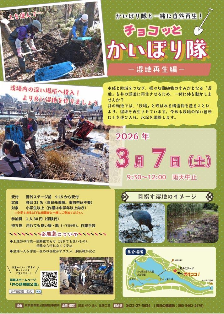 井の頭かいぼり隊と一緒に、水深が深めの場所に土を運び入れていい感じの湿地を整備しましょう!