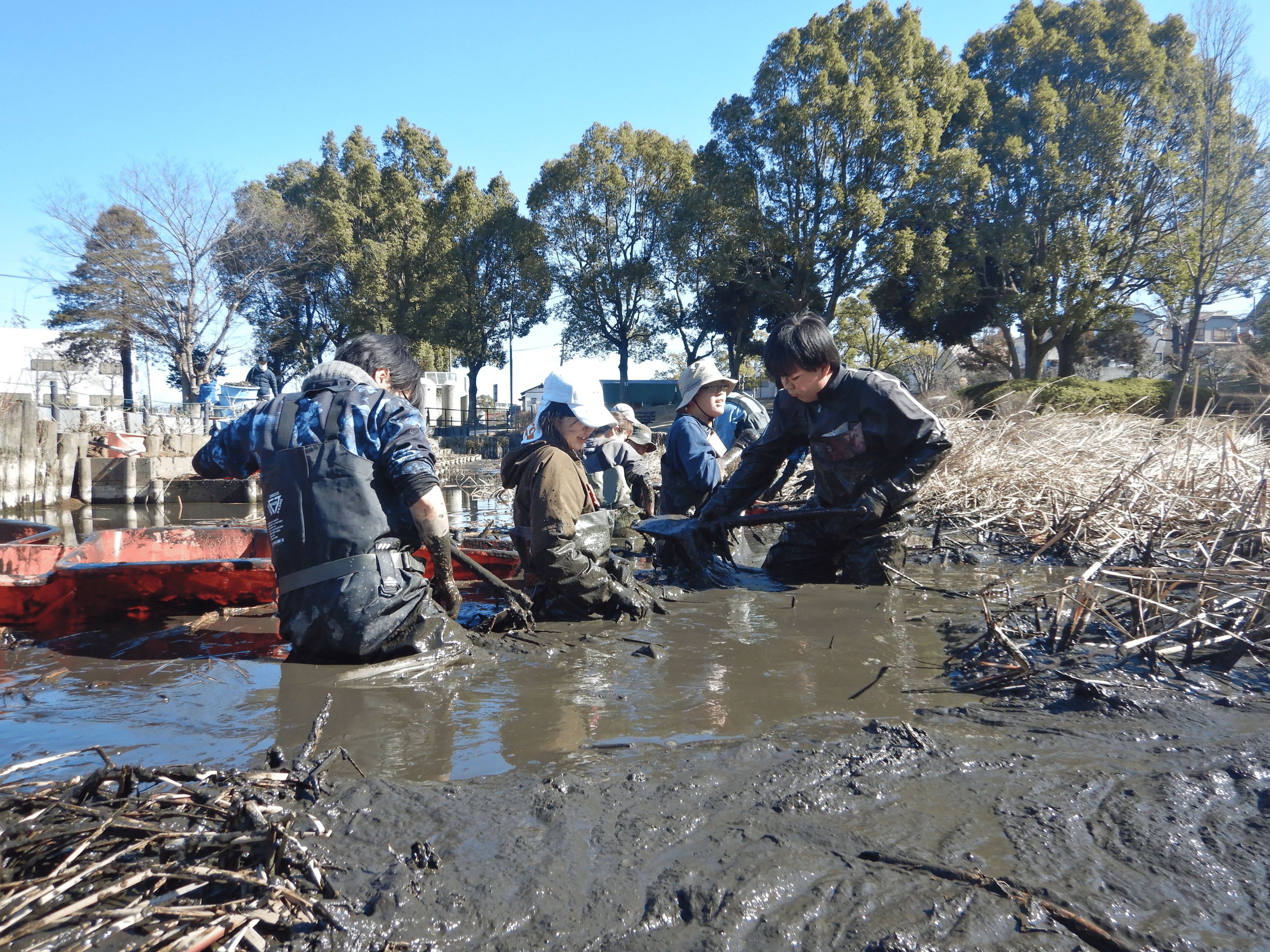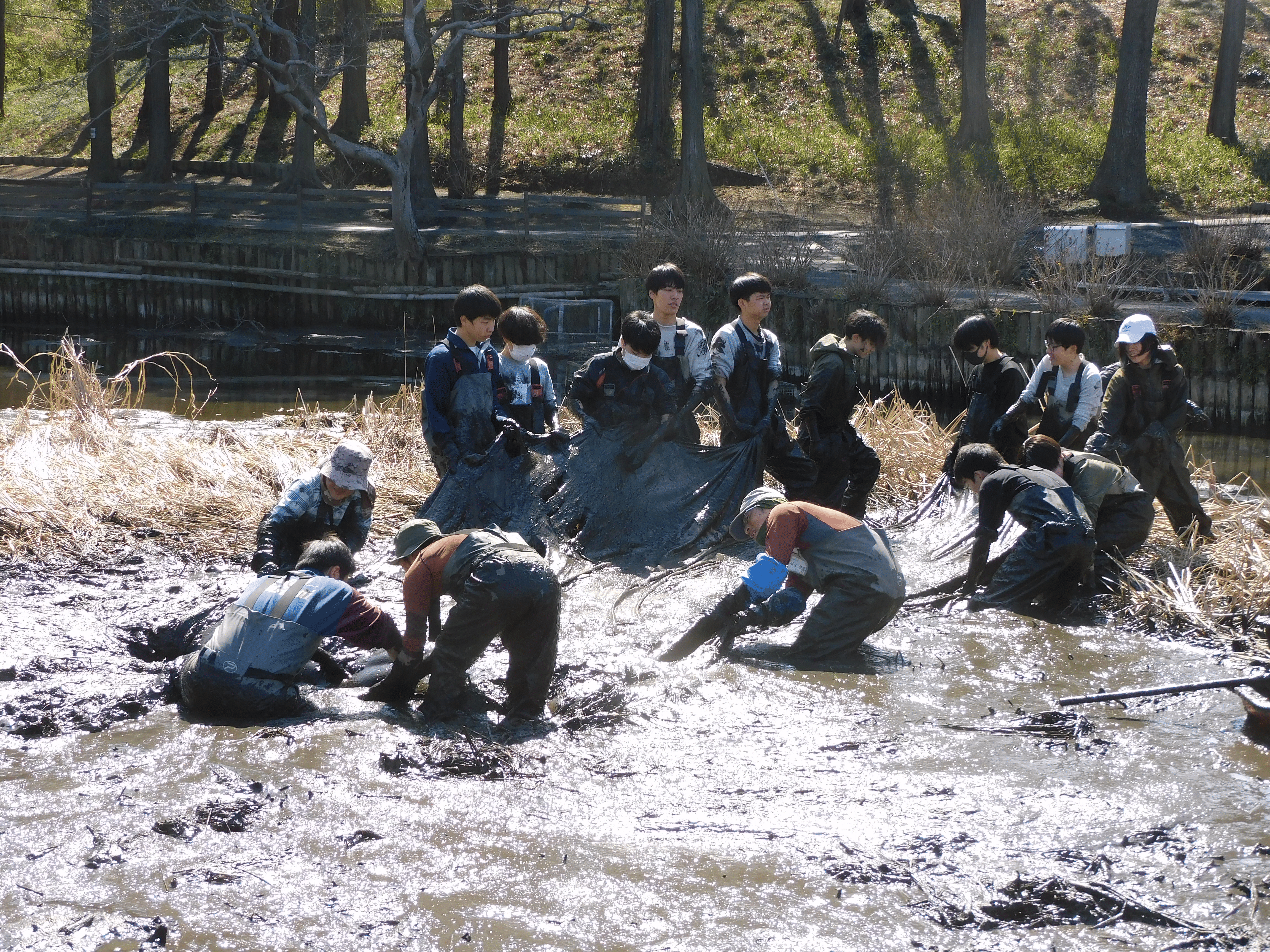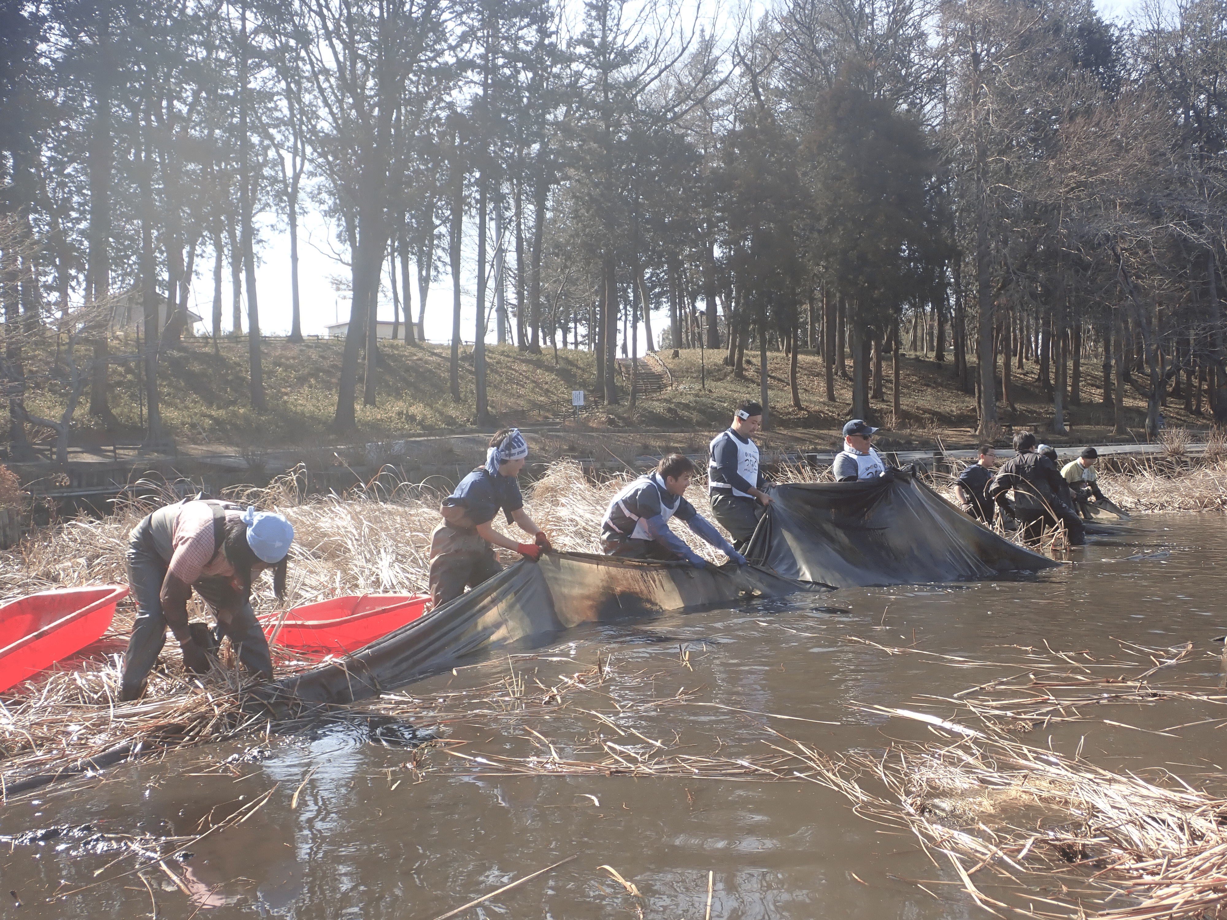 上尾丸山公園 水辺の保全作業「みんなで水辺守 池底のシートはがし!編」