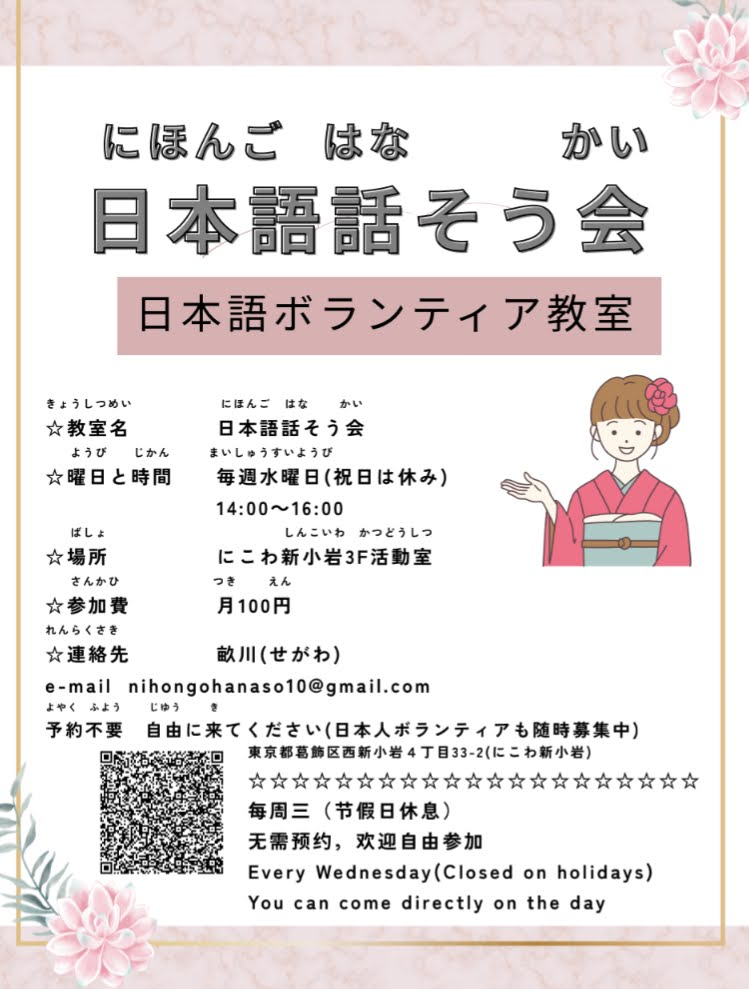 新小岩駅(JR総武線)で日本に住む外国人のために会話(おしゃべり)を通して日本語を教える日本語ボランティア教室です。