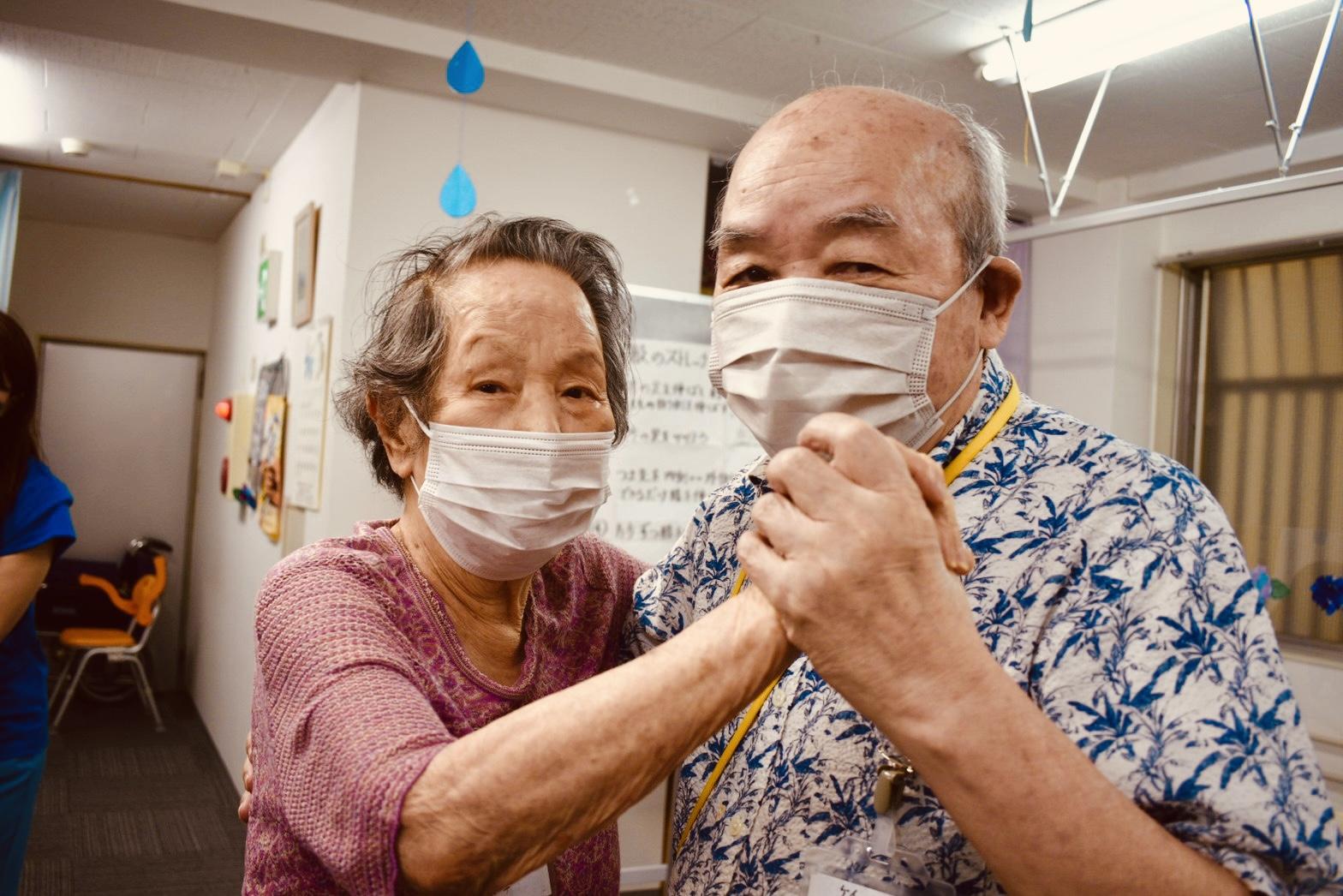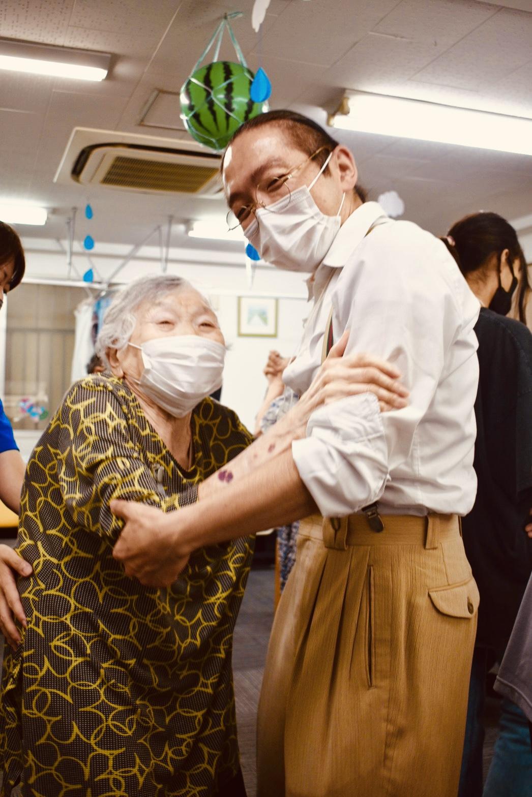 「タンゴセラピーははじめてなのよ!」とおっしゃるご利用者さまも、ステップ練習、ダンスタイムと進むにつれてすっかりなじんで、お誘いするとしっかり立ち上がってタンゴの組み方できれいにステップを踏んでくださいました。プログラムの終わるころには「こんなステップ、知らないかしら?」と左右の足が交差するステップを教えてくださったので、一緒にチャレンジ。うまくできたのでアブラッソ(抱擁)で喜び合いました!