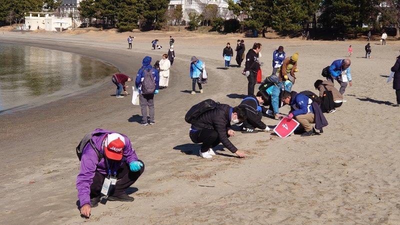 ・前日の荒天の影響で、マイクロプラスチックが眼下で確認できるほど、多く堆積していました。干潮の砂浜では、少し内陸の砂浜から微細のマイクロプラスチックや、タバコの吸い殻などを回収しました。皆さんはコツをつかんだ後、回収活動に集中してアッという間に30分が経過しました。回収用カップには、様々な微小のマイクロプラスチックを回収することが出来ました。レインボーブリッジ、東京タワーを望み全員で最後の記念写真を撮影いたしました。