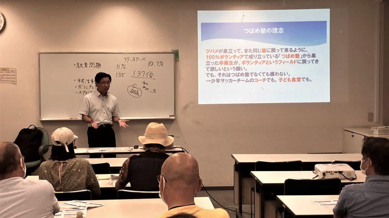 テーマを「無料塾を通した 地域・社会貢献活動」と題して、設立の経緯から始まり、ご自身の体験団を織り交ぜながら、中学生が置かれている厳しい現状、高校受験の東京都の特殊な事情、そして、つばめ塾を始めるきっかけ、理念、運営、財政など多岐にわたりました。