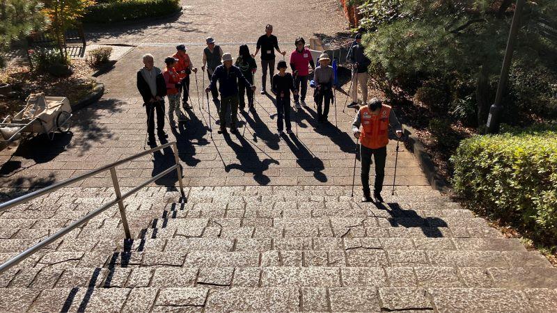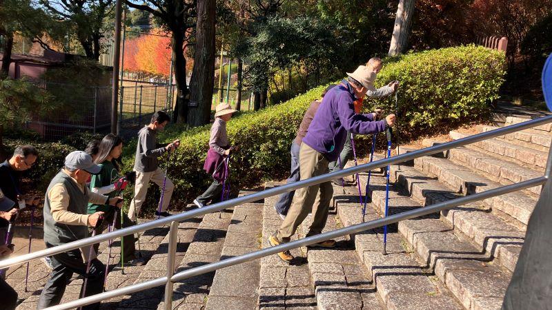次に、平らな園内をウォーキングして、体を慣らしてから、階段の上り下りや斜面の上り下りなど、陵南公園の起伏を生かしたルートを歩いていると、自然と背筋が伸びて、シャキッと歩けるようになりました。