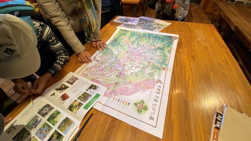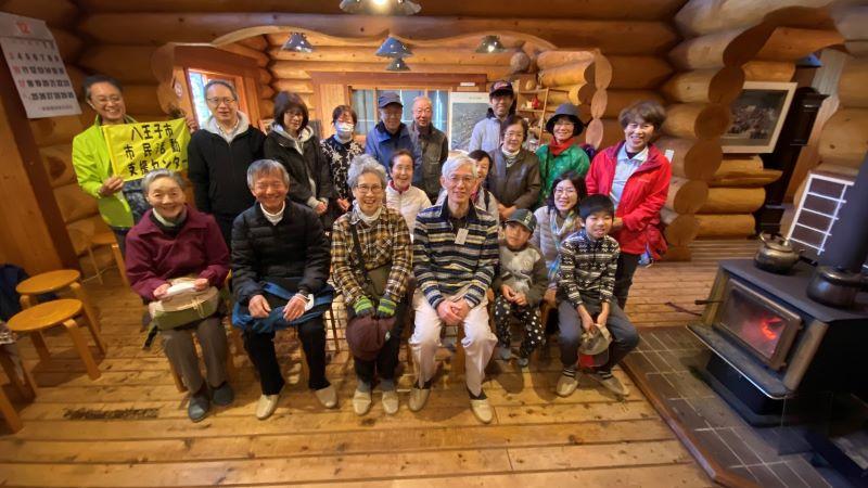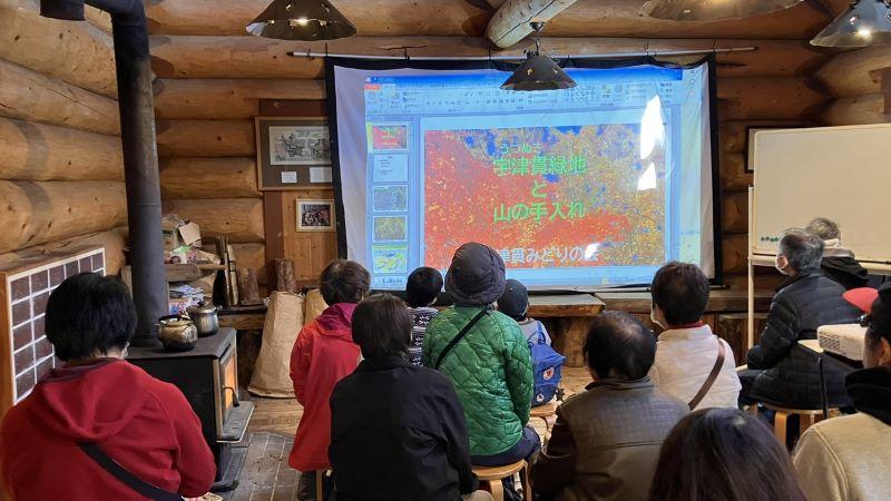 散策後ログハウスで宇津貫緑地について説明会が開催された。