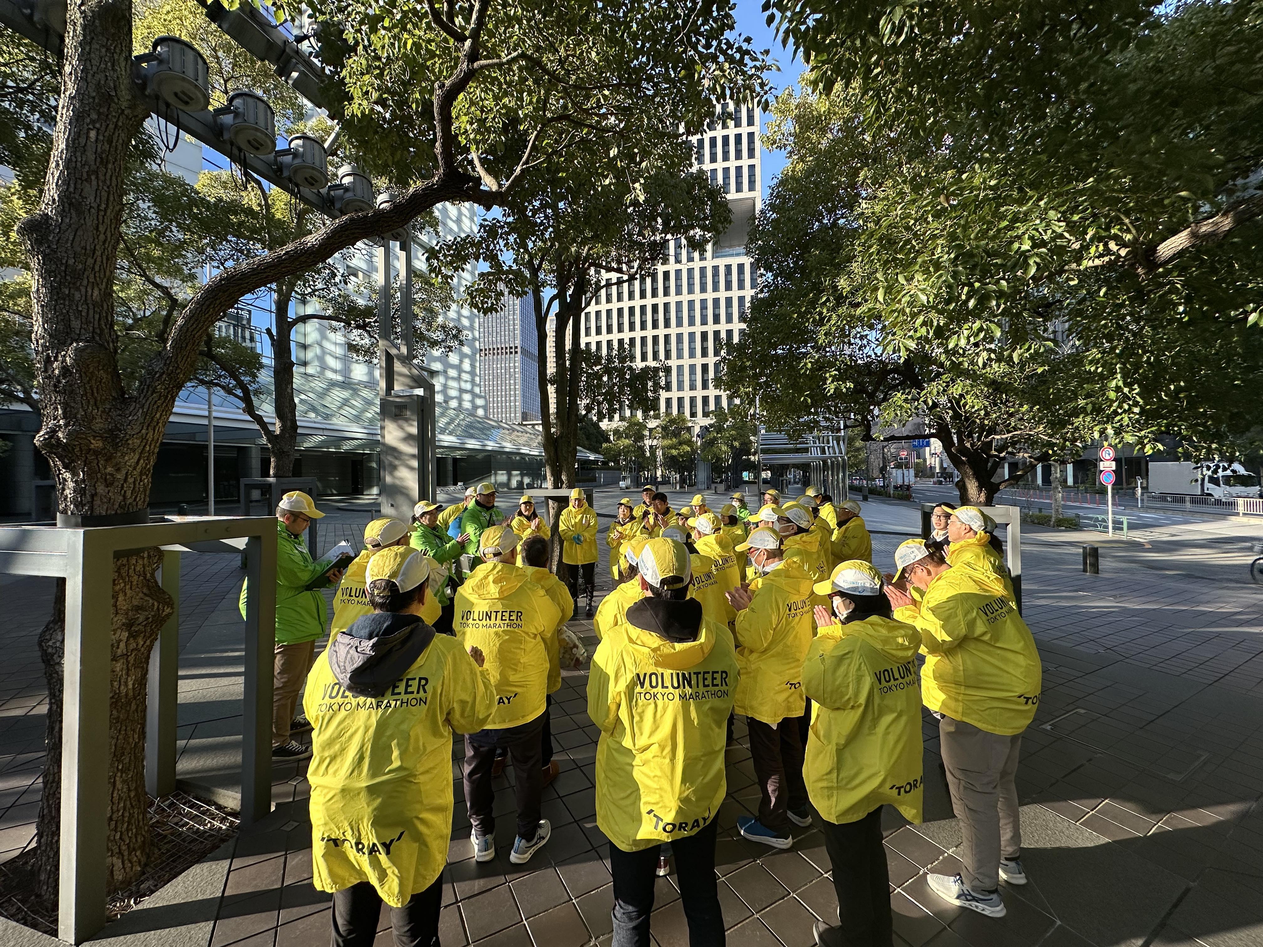 ・活動場所は、新橋・芝エリアの11区ランナーサポート、12区、13区、14区のコース管理として約2キロという広範囲の活動を担当しました。朝の8時40分過ぎには、多くのボランティア参加者が参集して、スタンバイしました。
