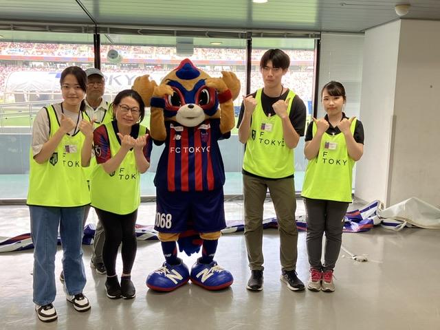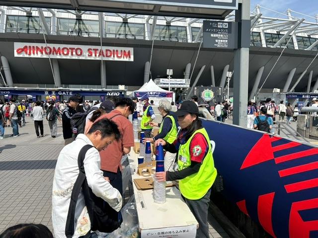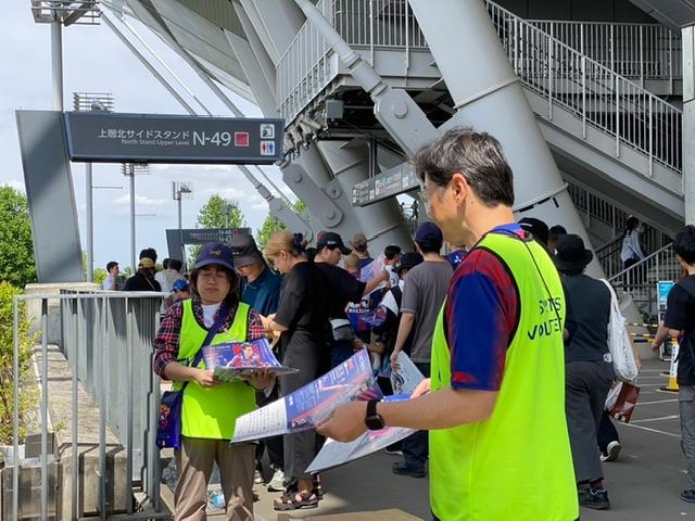 私は、マッチデープログラムの配布担当でしたが、一緒になって、「めちゃコミDayです」と言いながら配りました。こちらは、強い風にあおられ配布に苦労しましたが、ファイルを受け取ったお客様の笑顔は、私たちにもやる気をくれました。ありがとうございました。