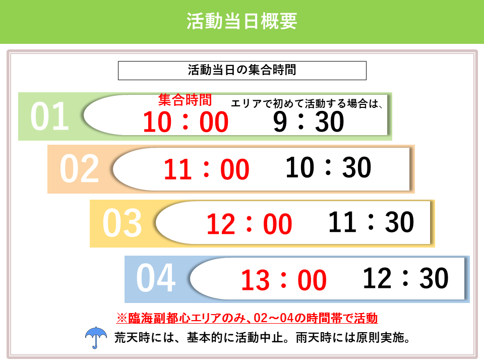※上記のうち、3時間程度活動していただきます(休憩1時間含む)。