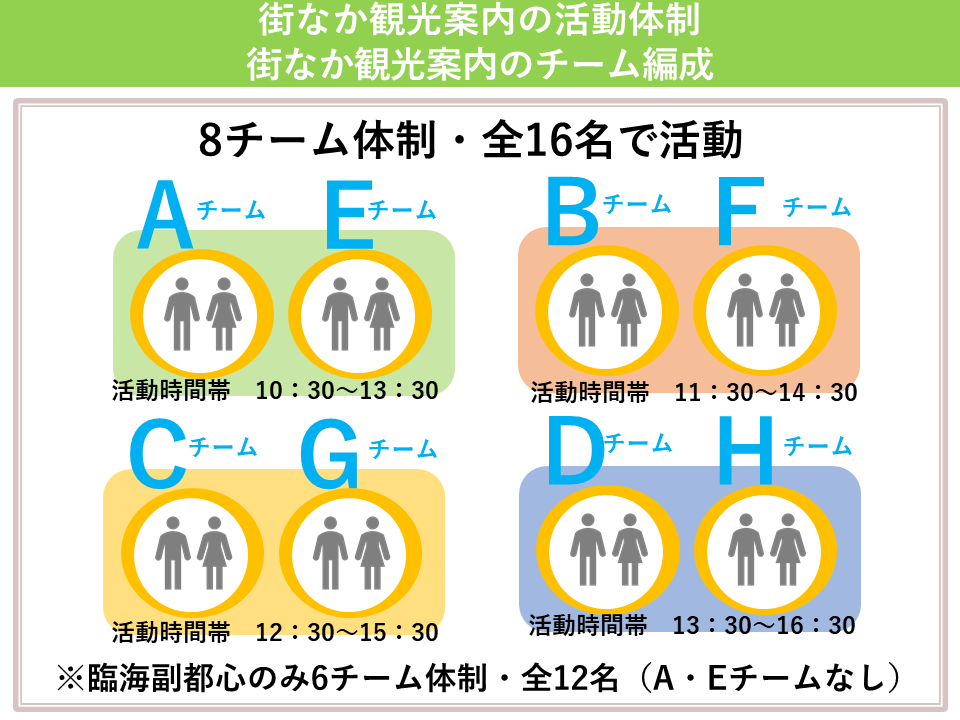 2人1組で活動し、観光情報をはじめ、周辺の飲食店や、ショッピング、イベントなどの情報を旅行者へご案内します。