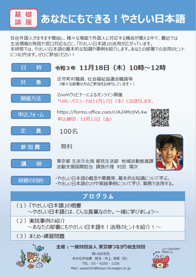 11月18日(木)に、東京都つながり創生財団が主催し、都内区市町村職員や、社会福祉協議会職員、東京都職員などを対象にしたやさしい日本語の基礎講座をオンラインにて実施しました。