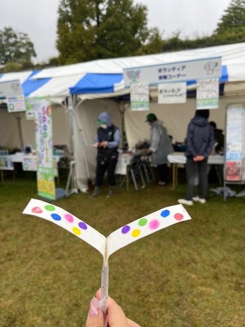 また、VLNの登録団体である「昭和記念公園ボランティア事務局」さんとコラボし、いつも公園で活動しているボランティアの方々と一緒に工作体験を提供しました。今回ご協力いただいたのは、公園に17あるボランティア団体のうち「花みどり文化センター」で活動している方々で、工作体験は「紙トンボであそぼう!」。チラシや牛乳パックから、飛ばして遊べる「紙トンボ」を作るというものです。