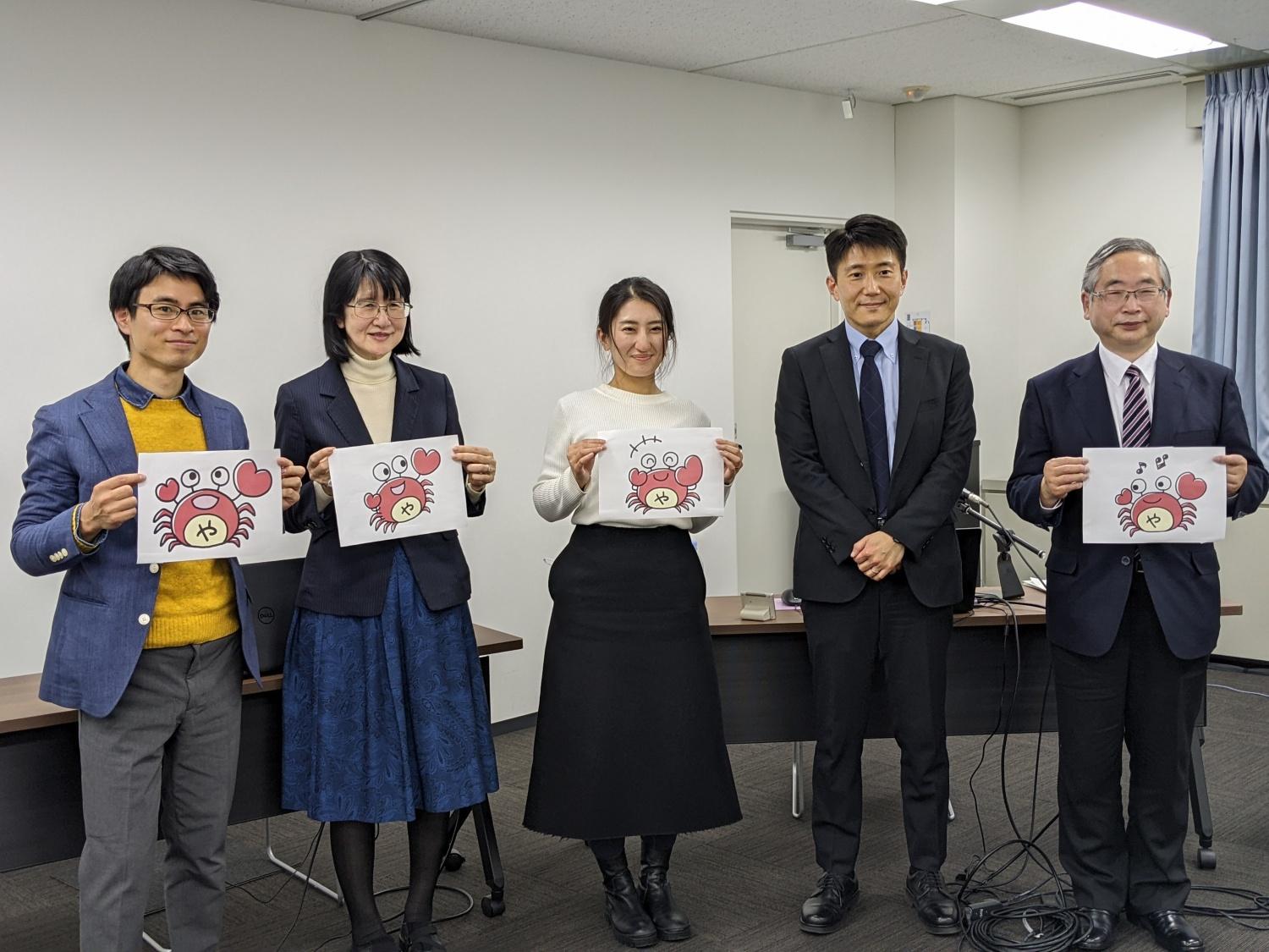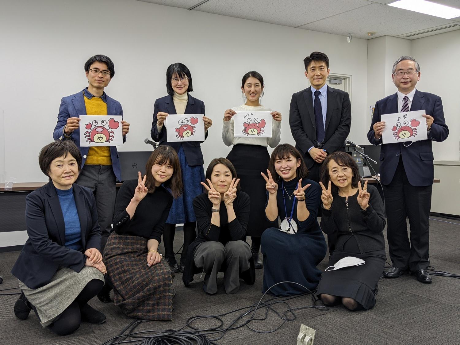 講師の皆さま。イメージキャラクターの「やさカニくん」と一緒に。