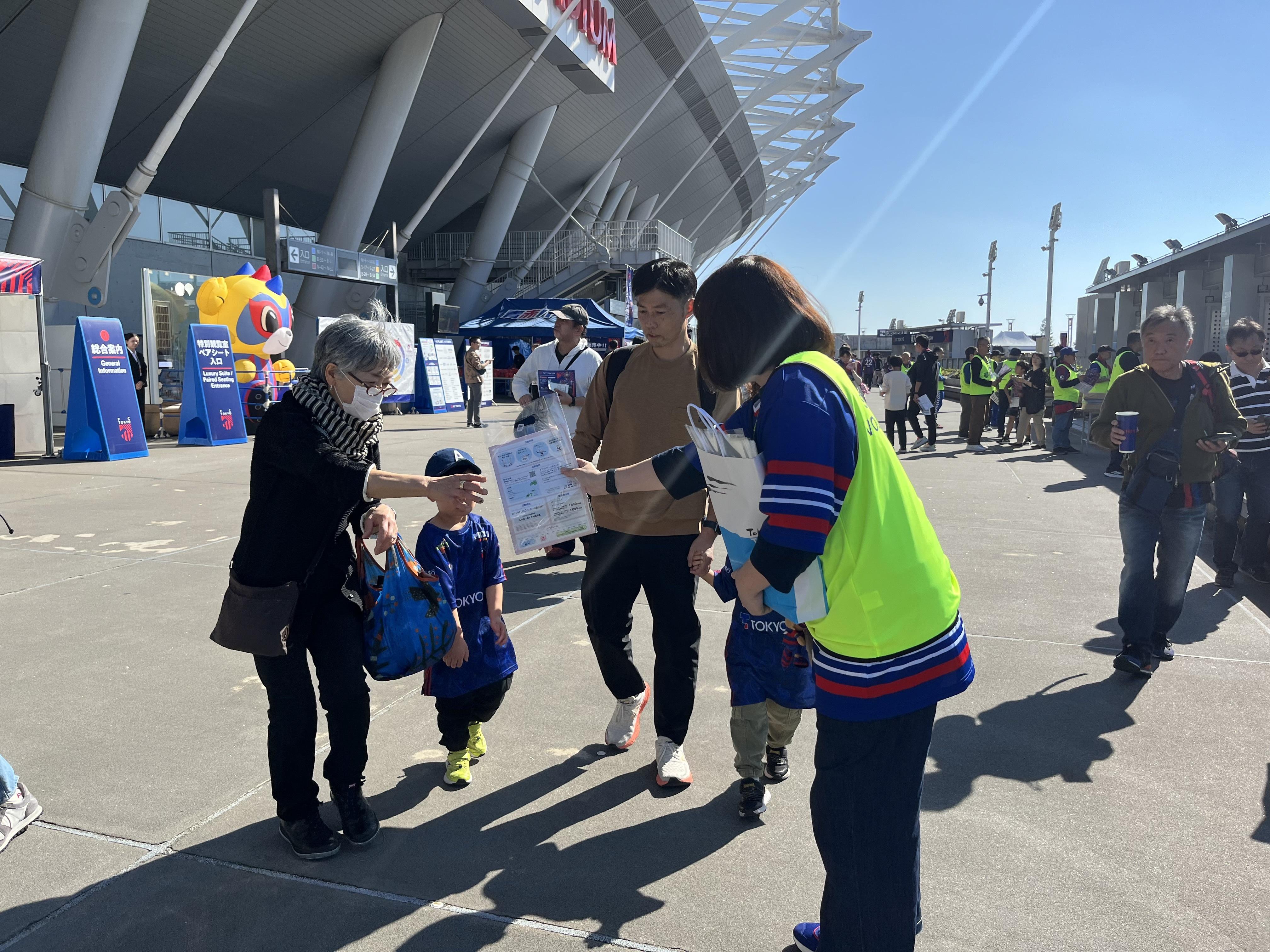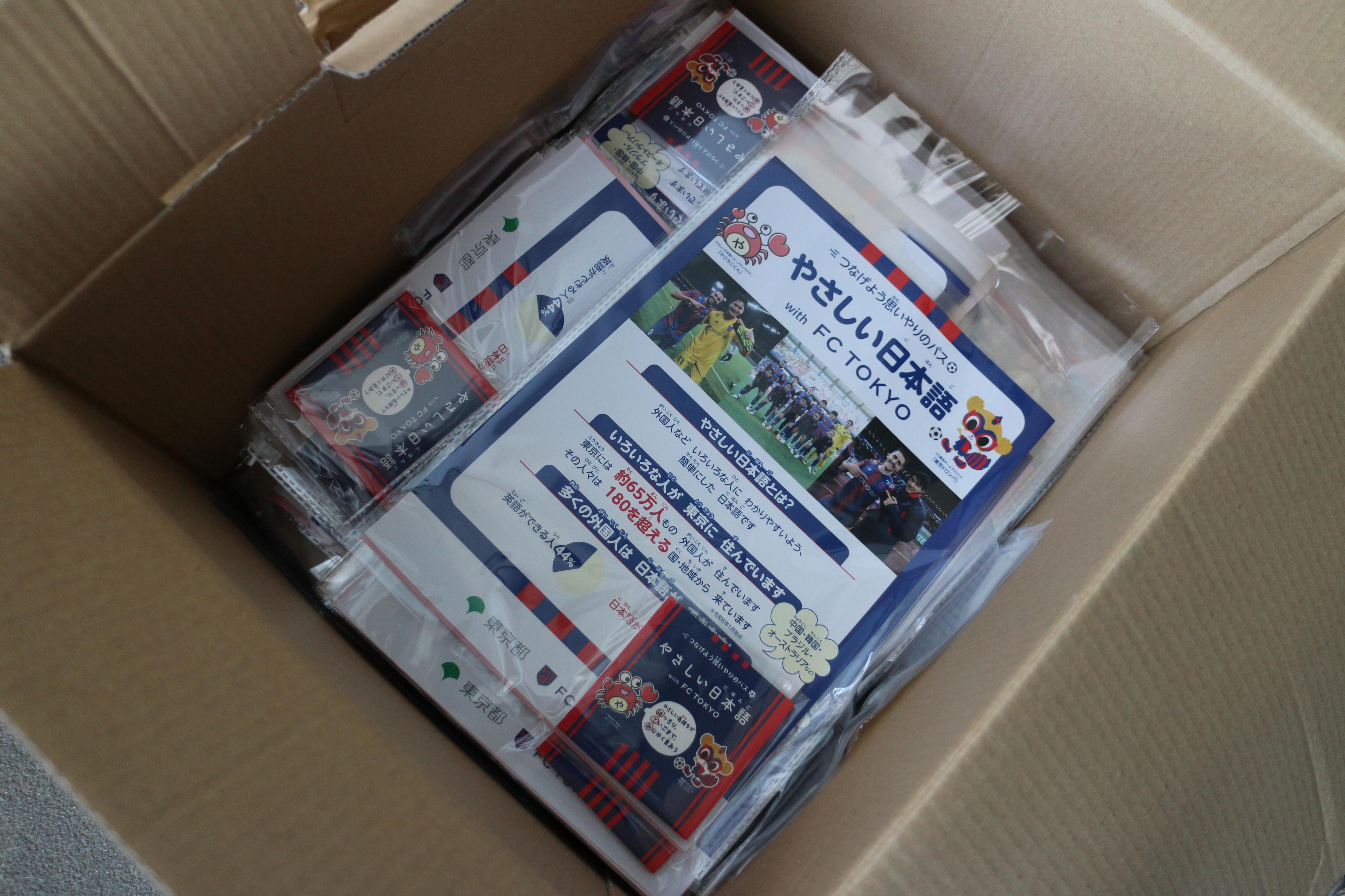 配布には、FC東京スポーツボランティアの皆さんにもご協力いただきまして、皆さんが明るく元気に「やさしい日本語のグッズです!」、「やさしい日本語よろしくお願いします!」と呼びかけてくださったおかげで、準備していた1500部を無事配布することができました。