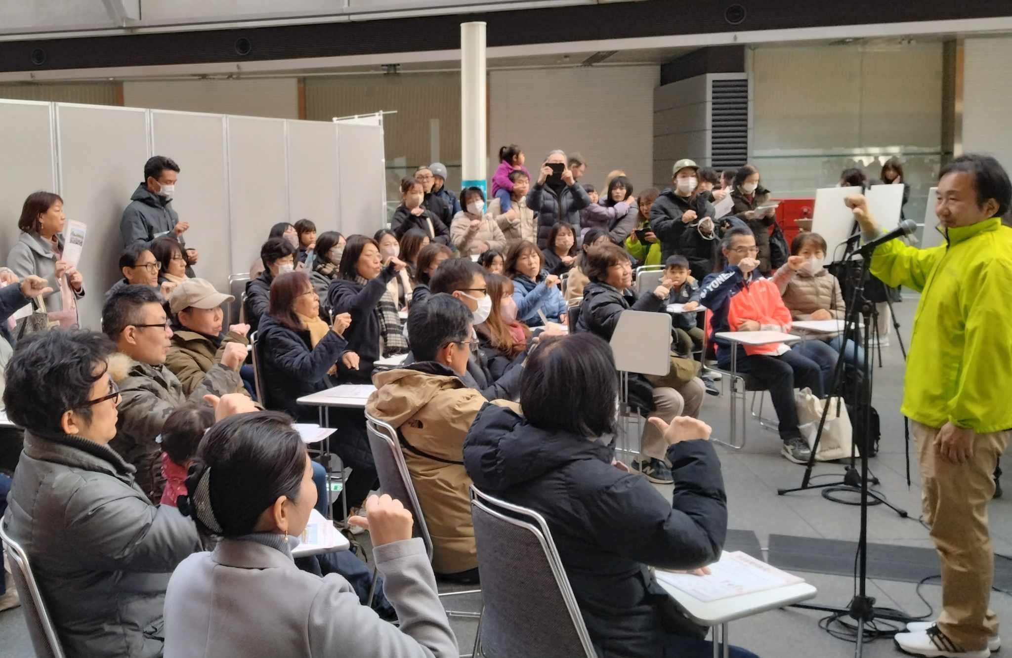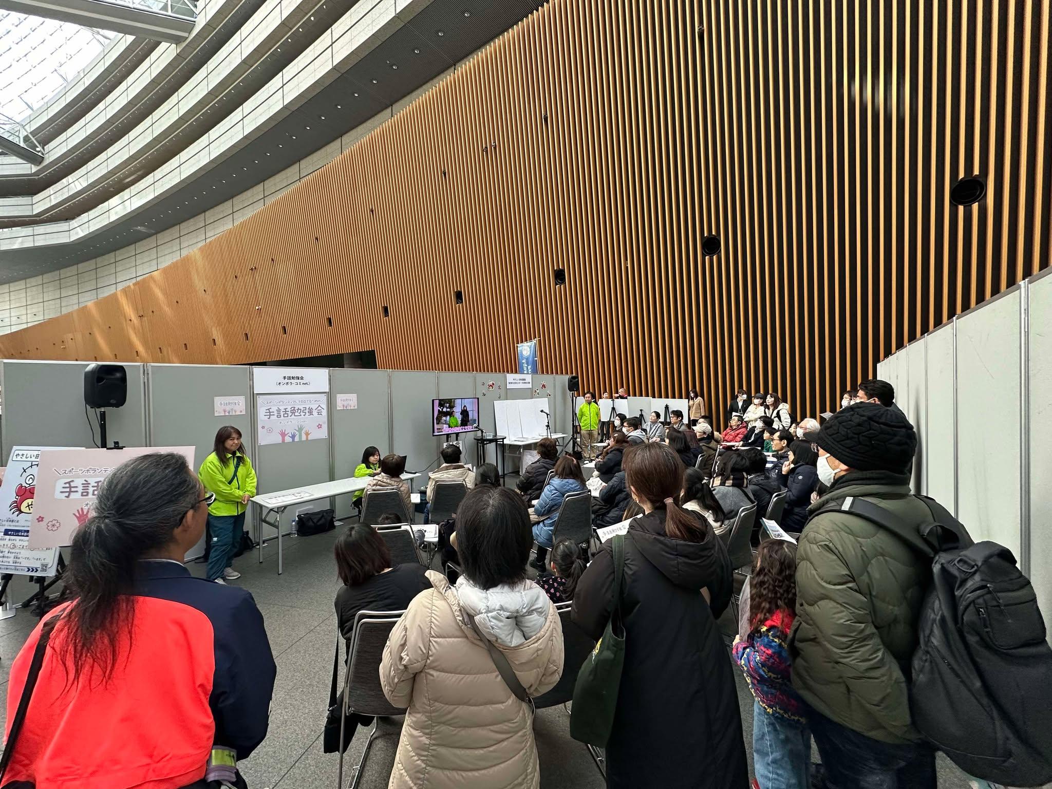 スポーツ会場の様々なシーンを想定した、ドラマ仕立てのケーススタディ映像を見ながら、楽しく、わかりやすく、ゆっくりと考えながら手話の基礎を学びました。参加者の方の手話を皆さんとともに学べる進行、和やかな雰囲気がワークショップ会場に広がりました。昨年の30人を超える92人(着席33人、立見59人)の参加者が集い、多くの参加者ともに勉強会を開催することが出来ました。この手話勉強会を毎回、監修サポートいただいております皆様に感謝申し上げます。