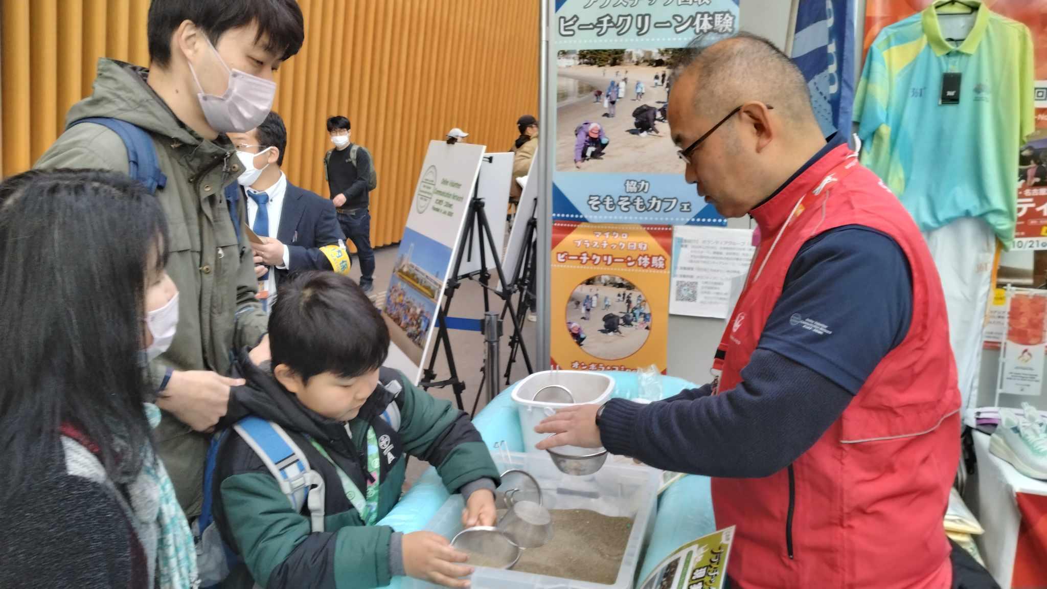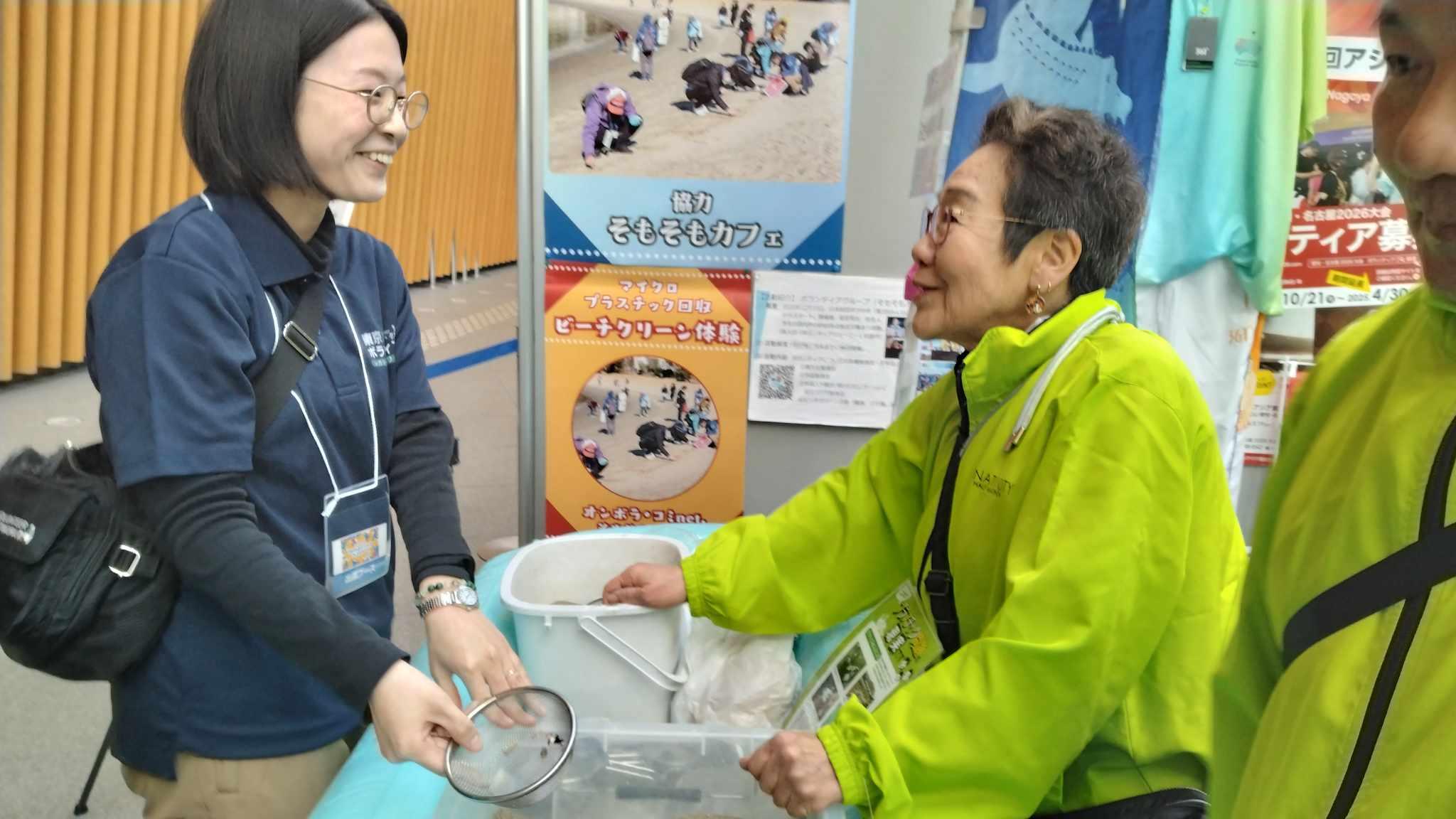 体験展示は 、①ビーチクリーン・マイクロプラスチック回収体験(そもそもカフェ)、②アップサイクル作成体験(マイクロプラスチックでアクセサリーづくり:チーム藤沢2020、スカイレッツ)、③オリジナル指文字ネームタグ作成(V-passport)、 ④愛知・名古屋アジア大会2026ボランティア募集(アジア大会組織委員会)をオンボラ・ブース内で行いました。
