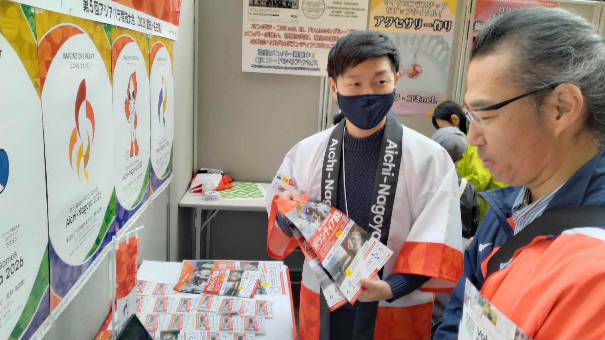 2026年に愛知・名古屋で行われるアジア大会のボランティア募集PRを行いました。ボランティア募集チラシ600枚も配り切りました。前回大会のウェアなどの展示も行いました。