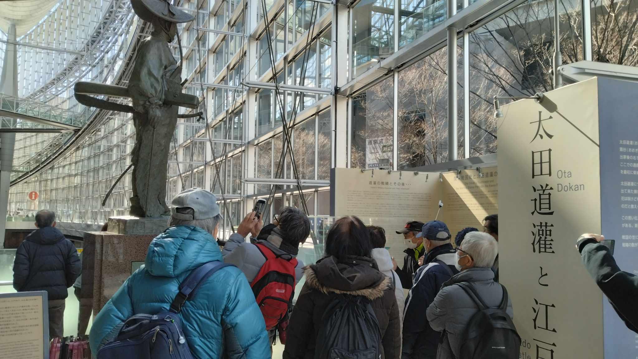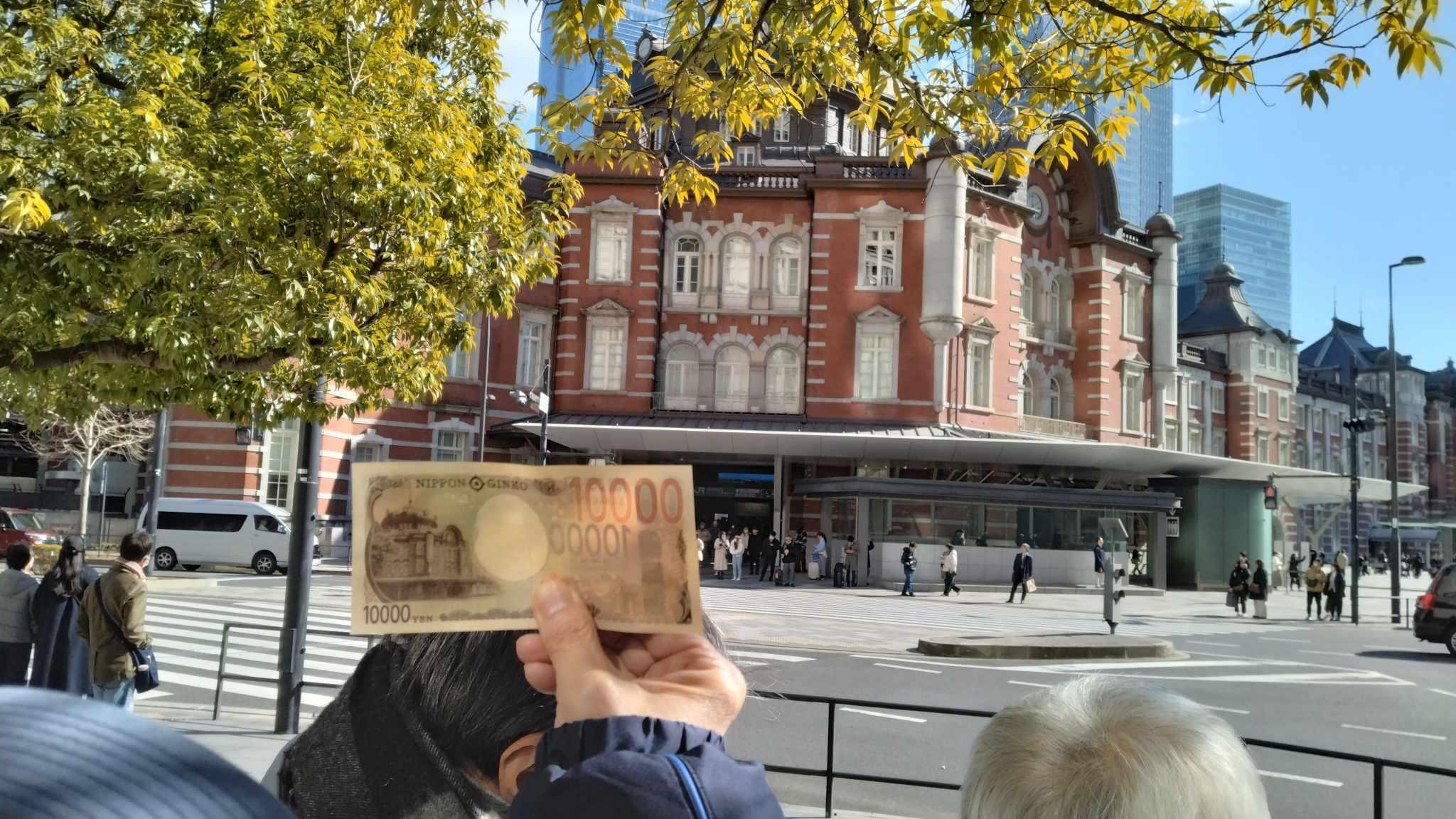 ナビゲーターの澤内隆さんの、バッチリクイズに沿って街歩きがスタート!太田道灌〜江戸城の解説。東京駅と相撲の関係、そして新紙幣1万円の裏に掲載されている東京駅が見える構図を訪問して、1万円札と一緒に撮影する事が出来ました。