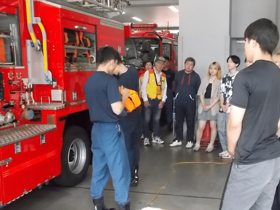2日目は、武蔵野消防ボランティア5名の協力の下、災害時支援ボランティア制度の説明、初期消火訓練、救助資器材の展示説明、消防車両の説明、消防隊の訓練見学、防火衣着装体験を行いました。