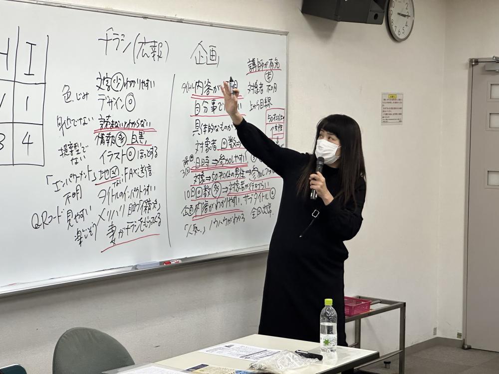 「全5時間ぐらいの講座であれば、本講座で紹介したチラシを見ながら企画について説明する内容、チラシのビフォーアフターの説明。さらにグループになって手書きのチラシを作成してもらう、というワークもあります。」また「終日コースで10時~16時というのもありですし、2時間×3回の連測講座もやっています。」 との回答をいただきました。