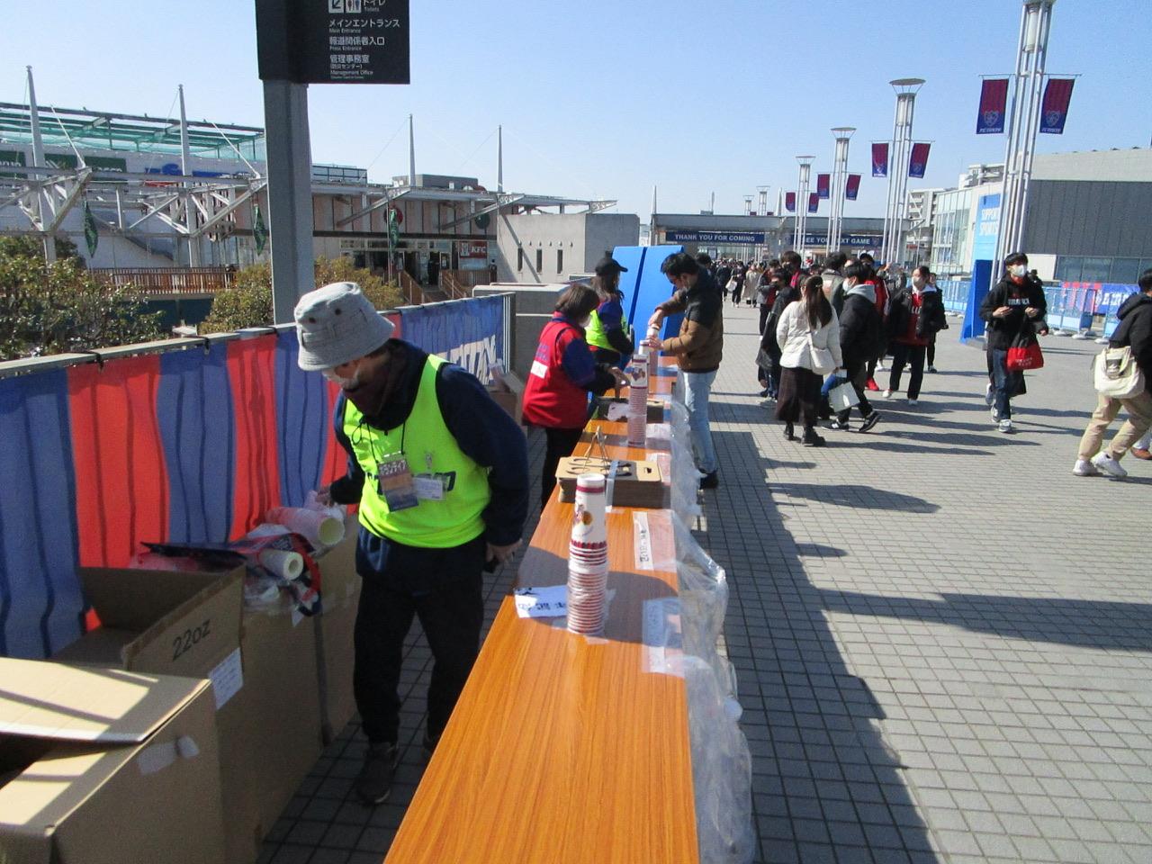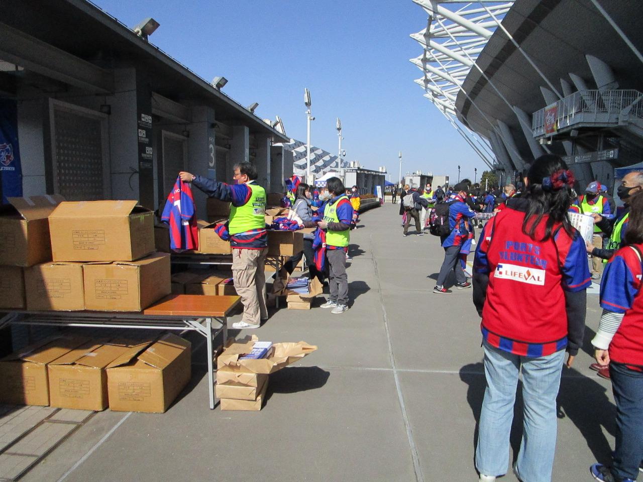 メインゲートから入場されるお客様は3時間前から並ぶゴール裏のコアサポーターの方は少ないのですが古くからの筋金入りの方もいらっしゃり「いつもご苦労様です」と労いのお言葉も頂戴しつつ、今日のスポンサー提供の配布物は毎年大人気のベースボールシャツだったので貰えた方はみなさん笑顔でした。メインなのでレッズサポーターもチラホラいて「俺たちも貰えるの?」って聞いてきたので「いいんです、その代わり勝ち点3は置いていって下さい」と軽口を叩きながら配布、レッズサポーターとの交流も楽しめます。我々ボランティアスタッフはチームの一員としてFC東京サポだけでなくスタジアムに来ていただいた全ての方におもてなしの精神で接し楽しんで頂けるように頑張ってます。初めての方でももう一度来たいと思って貰えたら望外の喜びであり、来場者の笑顔が私たちの報酬です。皆さんもよろしかったら一度は味スタでFC東京のボランティアを体験してみて下さい