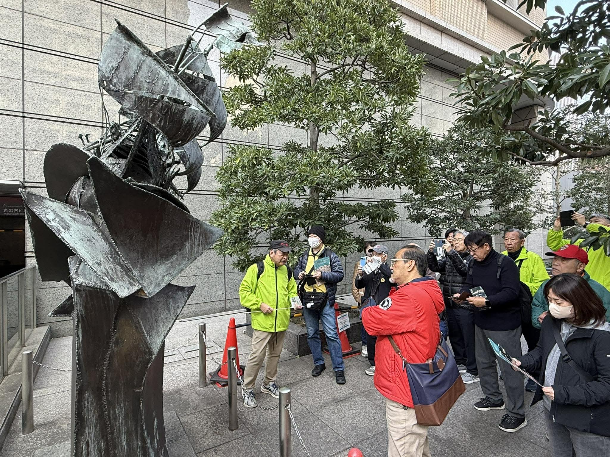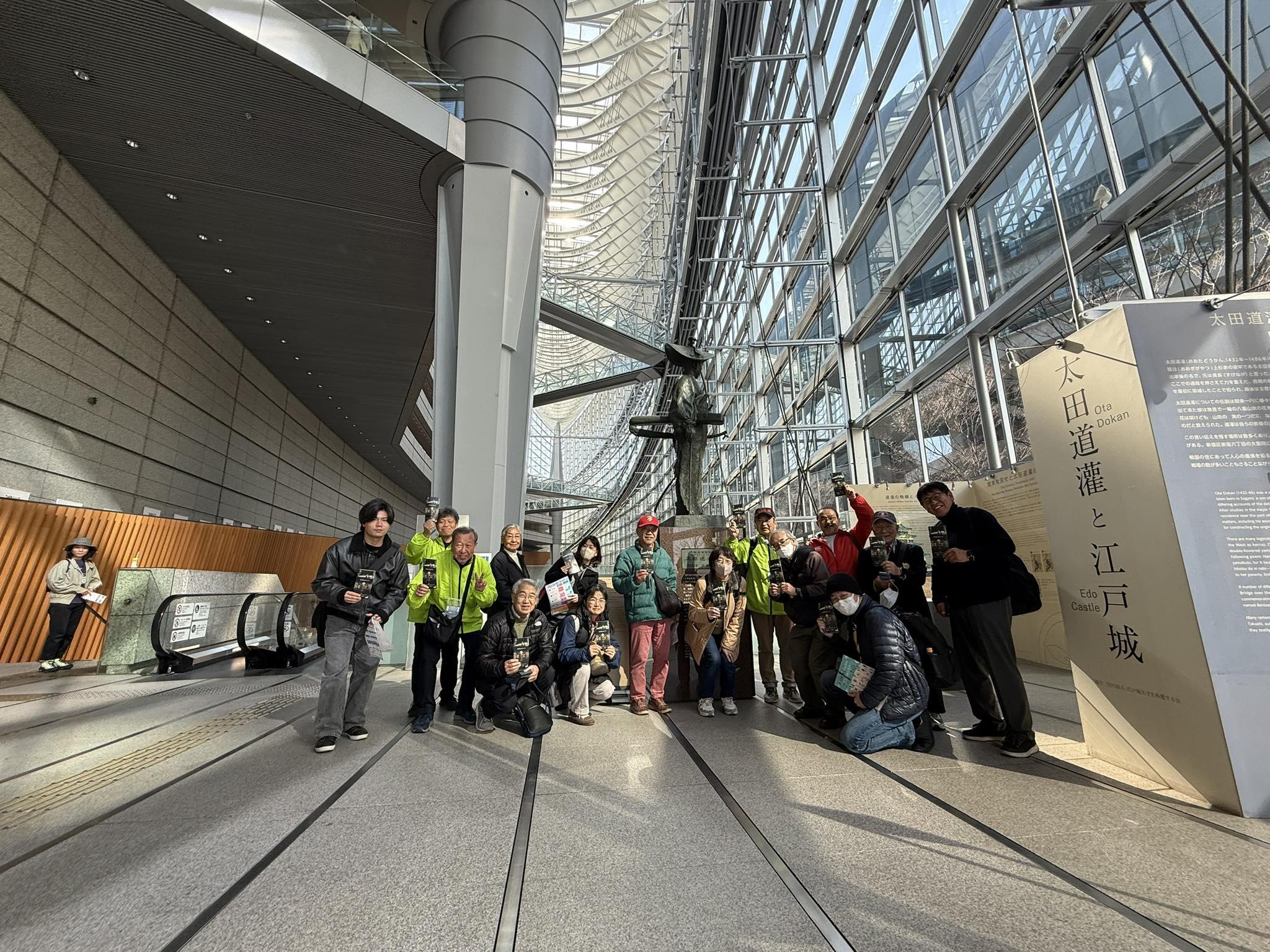 ナビゲーターのオンボラ・コミnet.共同代表の澤内隆さんの、バッチリクイズに沿って街歩きがスタート!太田道灌〜江戸城の解説。東京駅と相撲の関係、そして新紙幣1万円の裏に掲載されている東京駅が見える構図を訪問して、1万円札と一緒に撮影する事が出来ました。