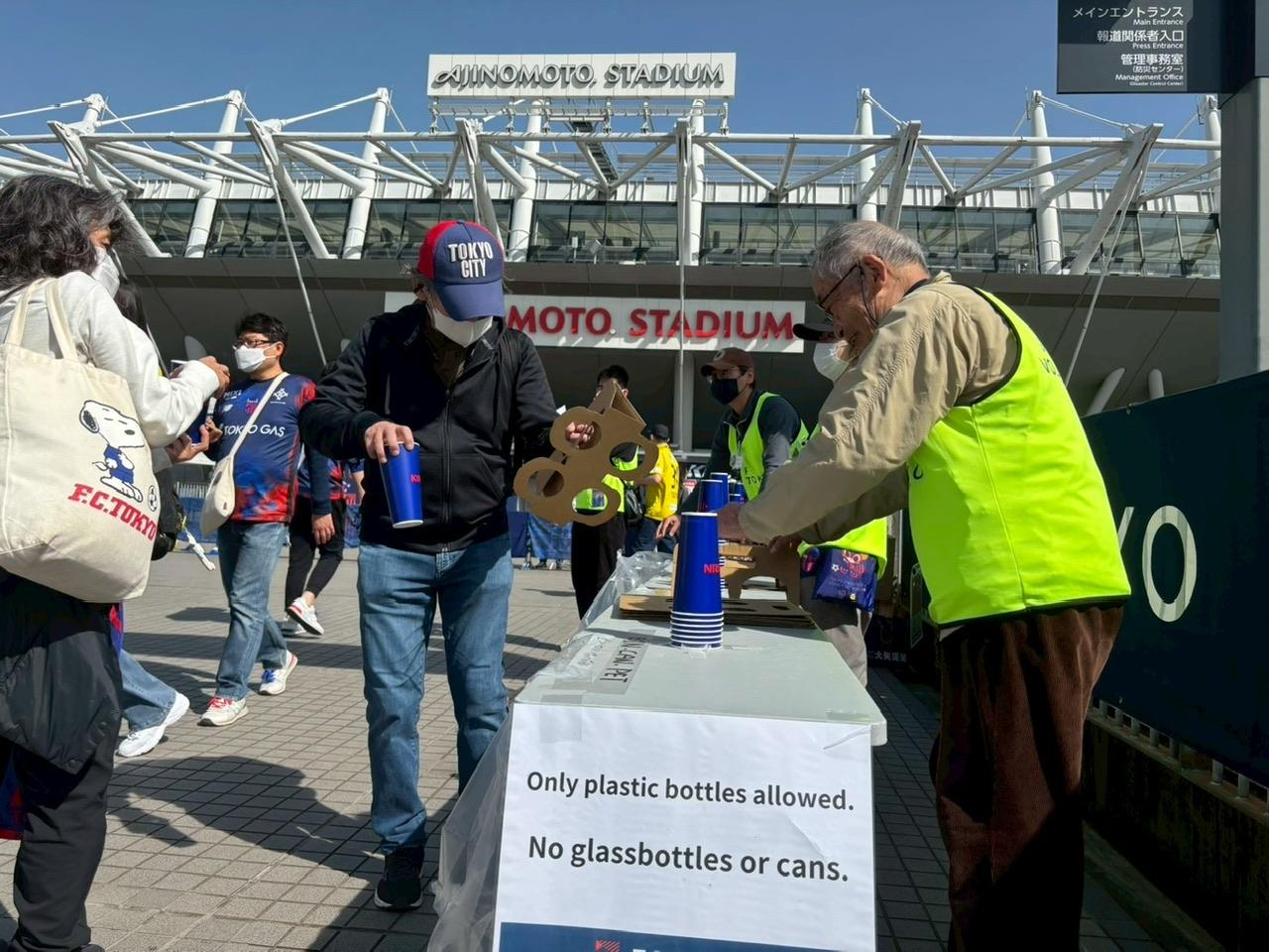 紙コップを持ってお客様はいざ!勝利願ってスタジアムへ!