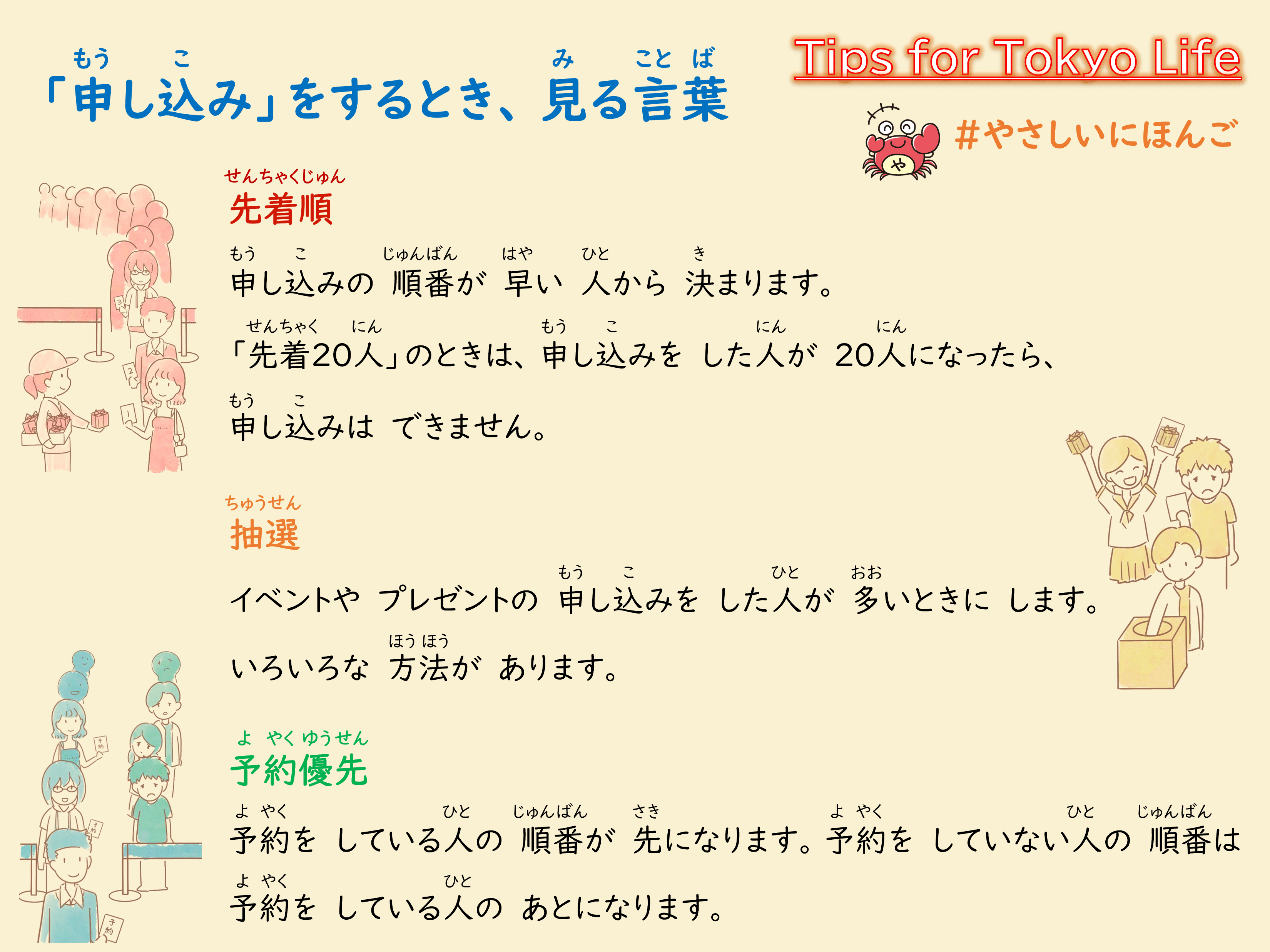 今月は「申し込みのときに、見る言葉(先着順・抽選・予約優先)」をやさしい日本語で説明しています。