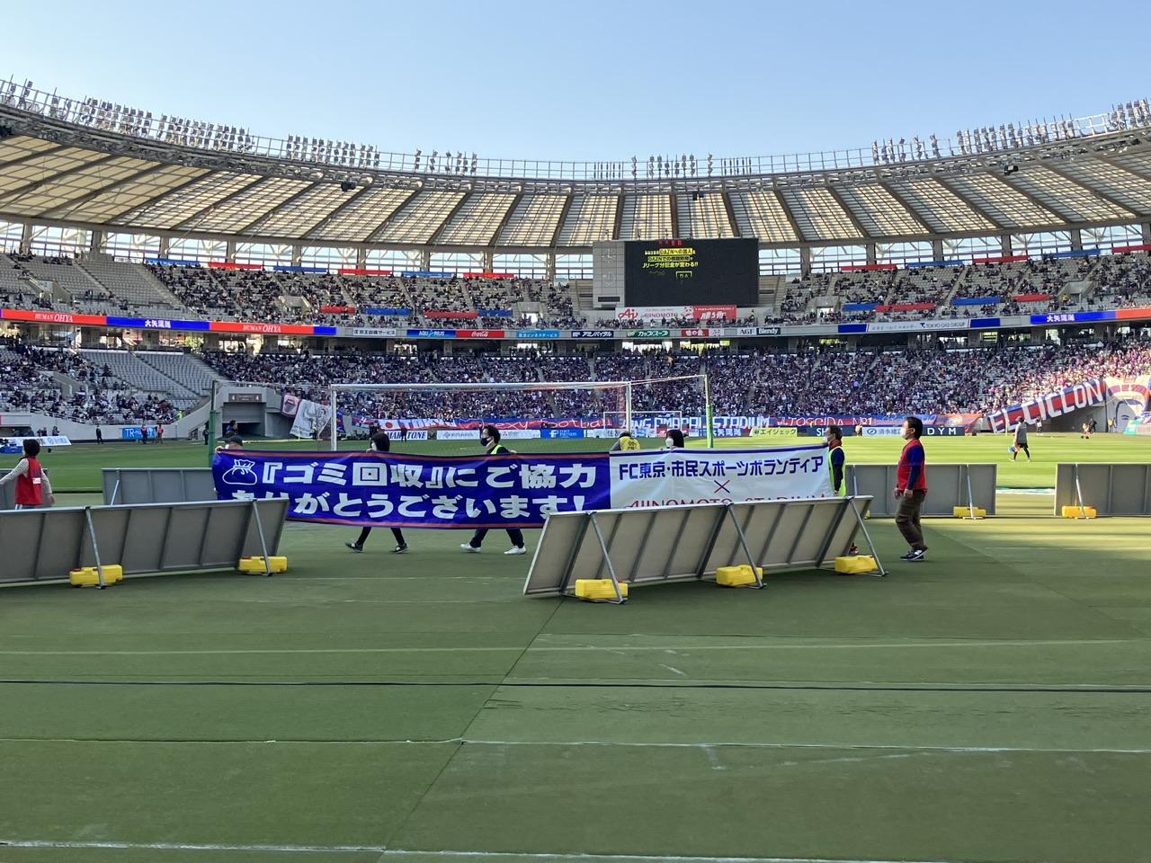 ハーフタイムには、スタジアム美化の横断幕を持ってピッチサイドを周回します。新人の方がメインに参加します。満員(残念ながら、この日は満員ではなかったですが)のスタジアム見上げながら、ピッチサイドを歩くのは、なんとも言えず、いい気持ちです!