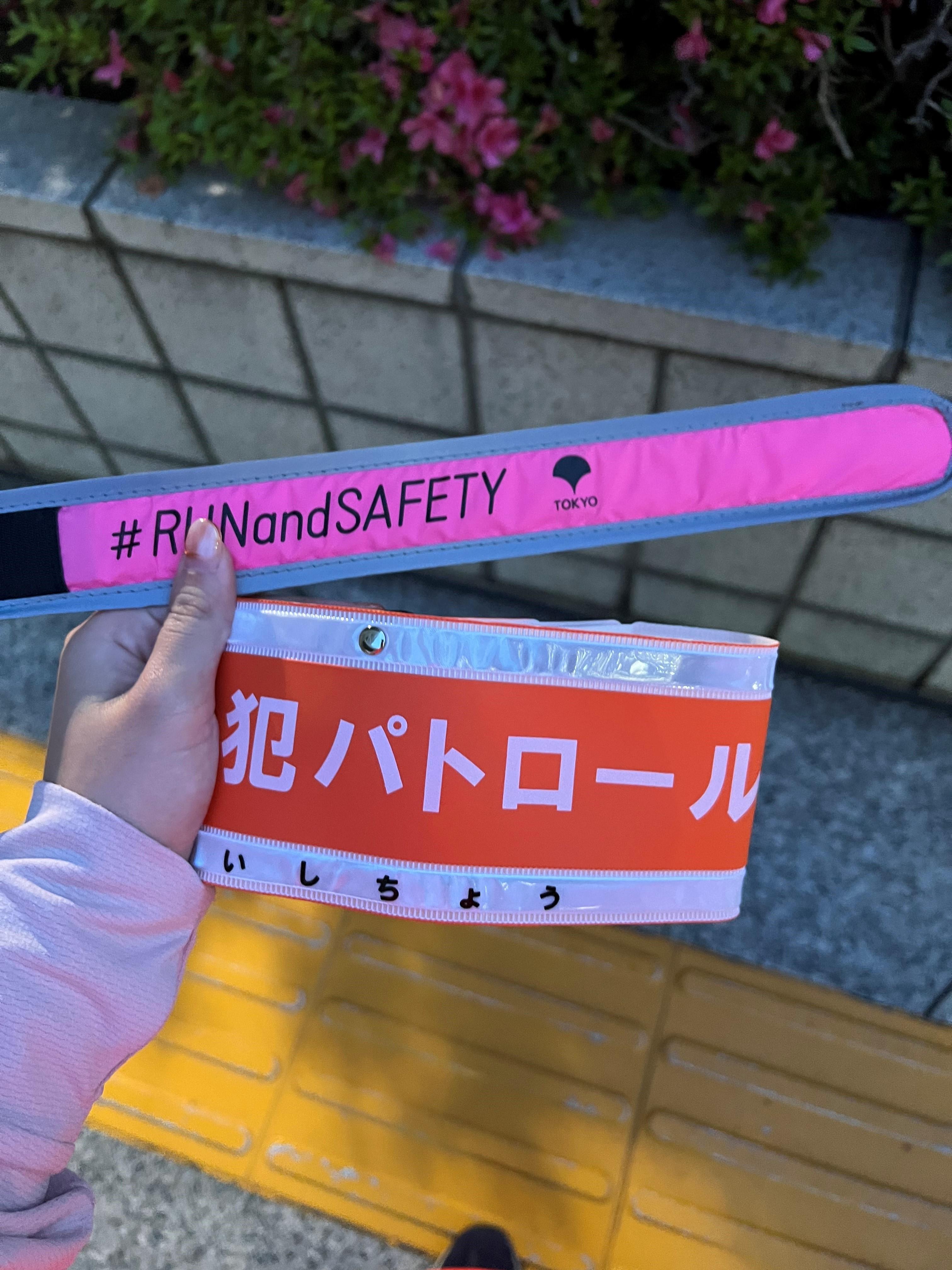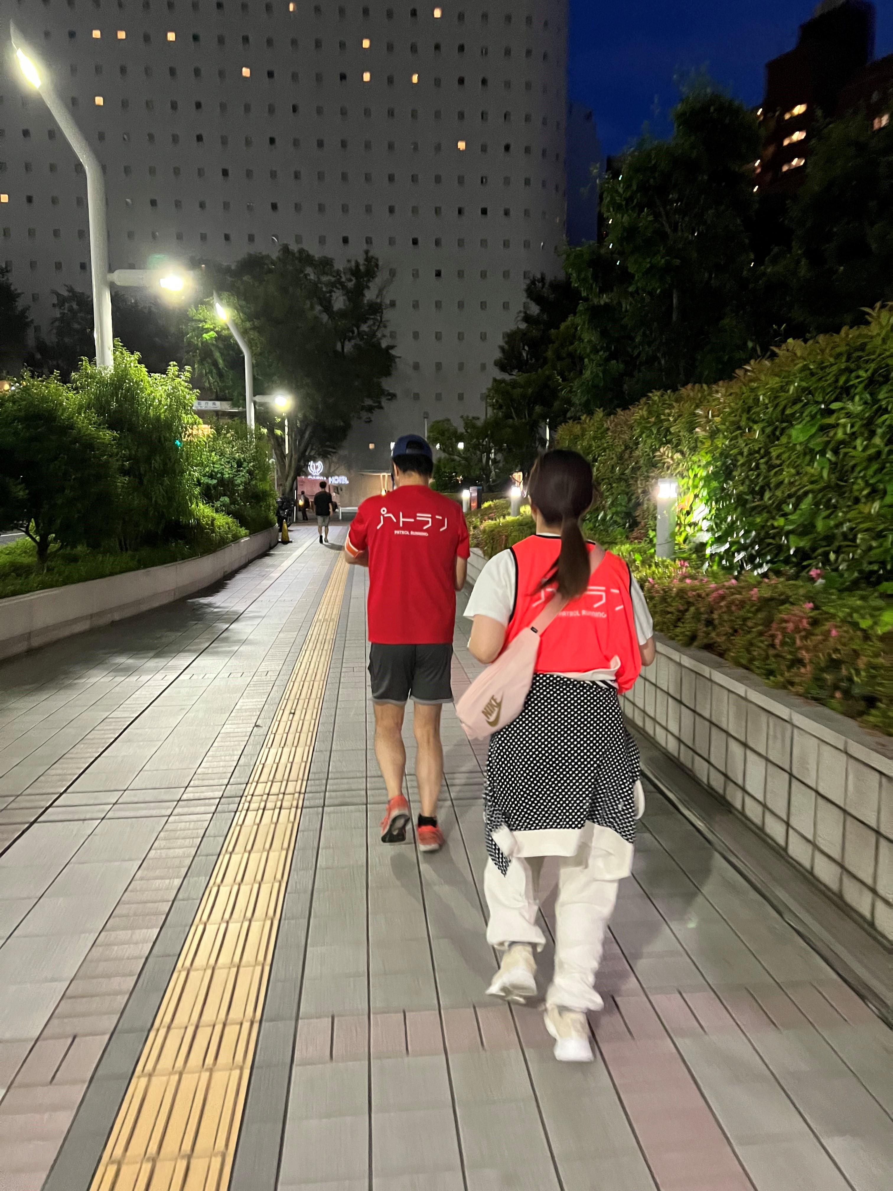 この日の集合場所は、東京都庁第二本庁舎前。胸に「パトラン」と書かれた、真っ赤なシャツが目印となり、すぐに集合することができました。赤いシャツを持っていない場合は、「パトラン」と書かれたビブスをお借りすることができ、初めての参加でも安心でした。夜の活動だったので、危険のないように、アームライトと「防犯パトロール」と書かれた腕章を身に着けて装備は完了です。