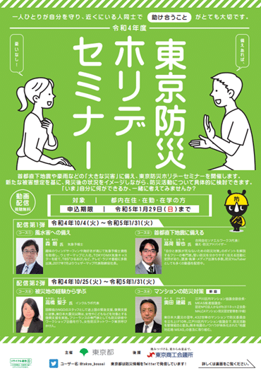 「防災ウーマンセミナー」、「東京防災ホリデーセミナー」ともに申し込みは令和5年1月29日(日曜日)までで、動画配信期間は令和5年1月31日(火曜日)のようです。