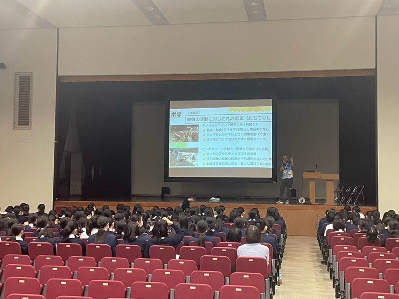 かとちゃんさんは、スポーツボランティアを中心に活動しているほか、幕張と江の島でのビーチクリーン活動にも積極的に参加しています。ご自身の経験をもとに、生徒の皆さんに語りかけます。