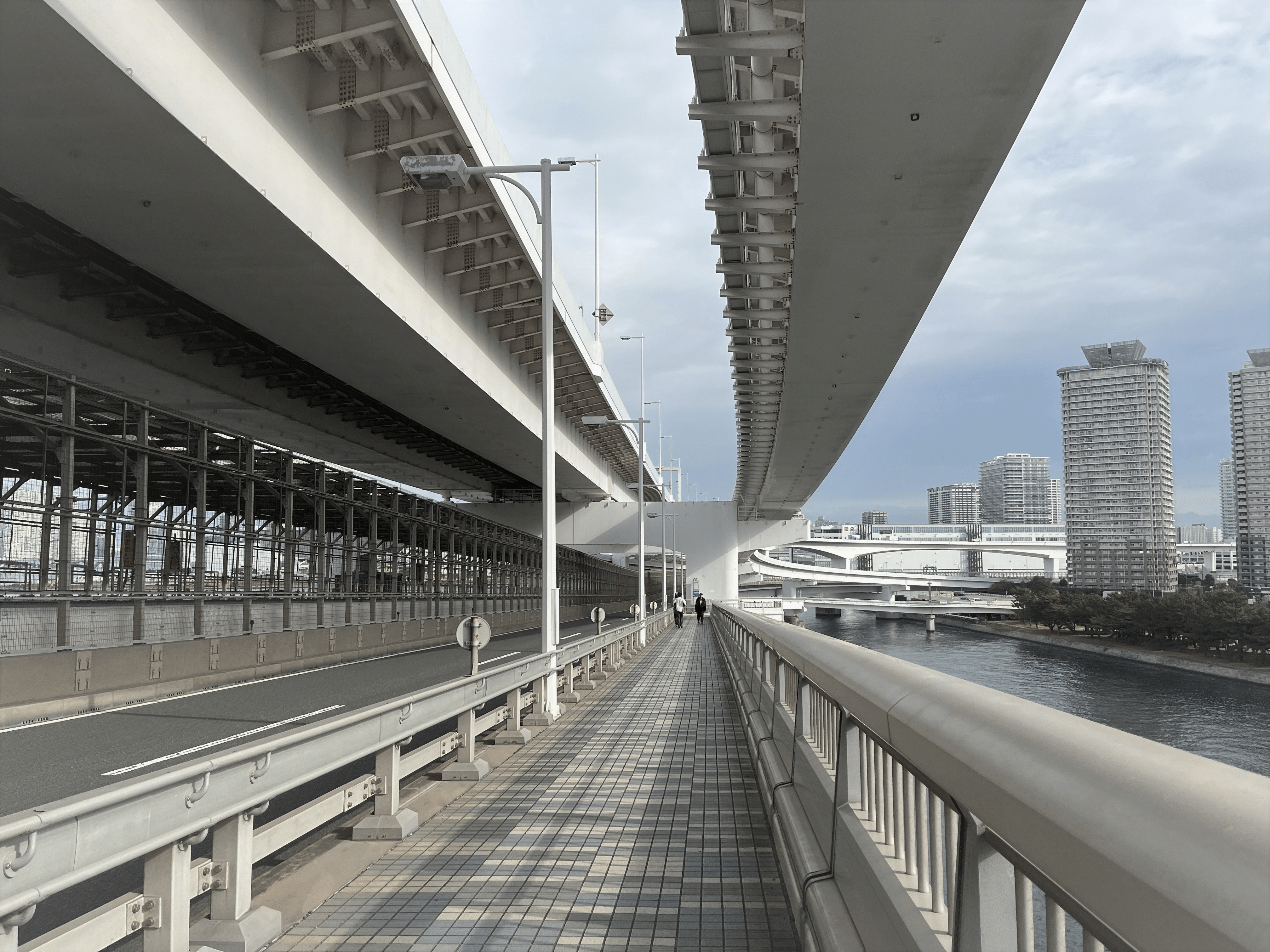 竹芝駅を過ぎて、日の出、芝浦ふ頭とゆりかもめの駅に沿って歩いていると、目の前にレインボーブリッジが!