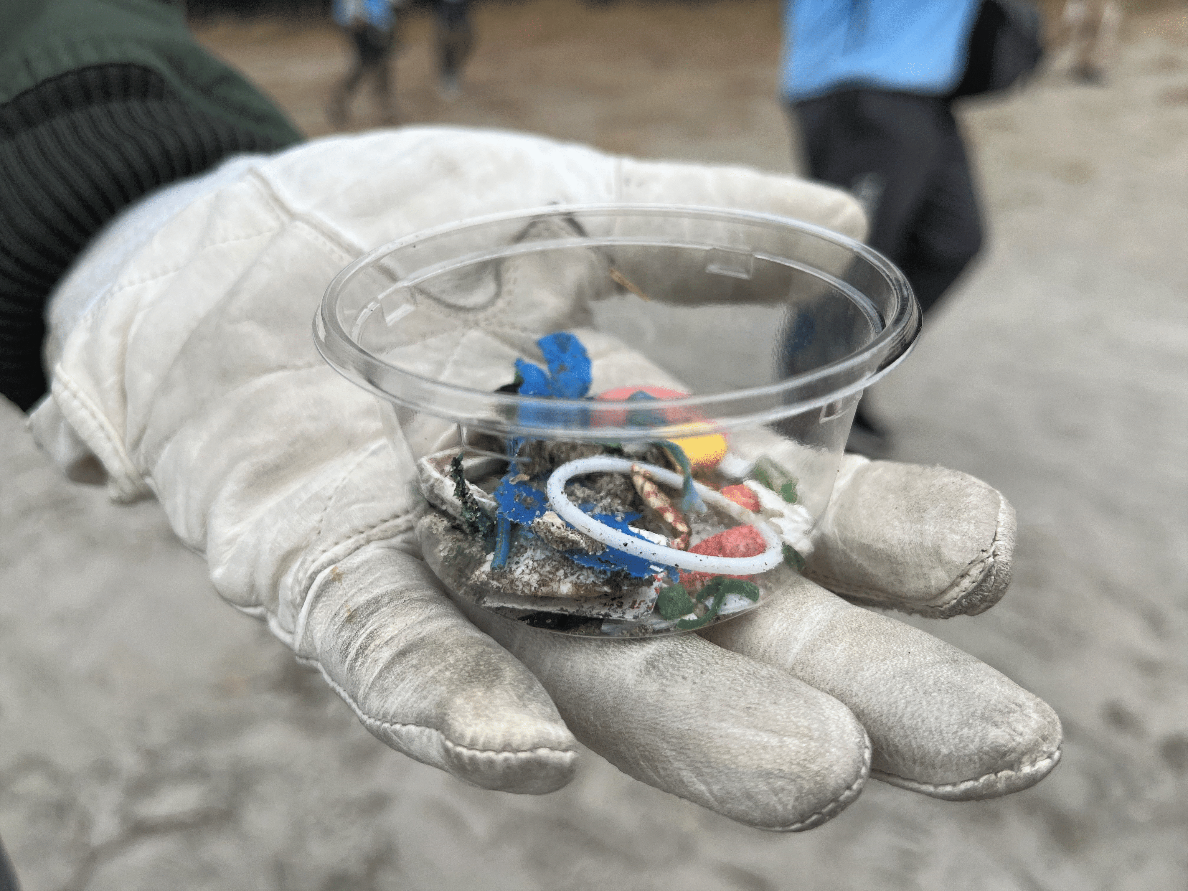 一見きれいな浜でも、砂をかき分けるように触ってみると、多くのプラスチックの破片があることに気づきました。15分程の活動でも、カップが一杯になるほどの量でした。