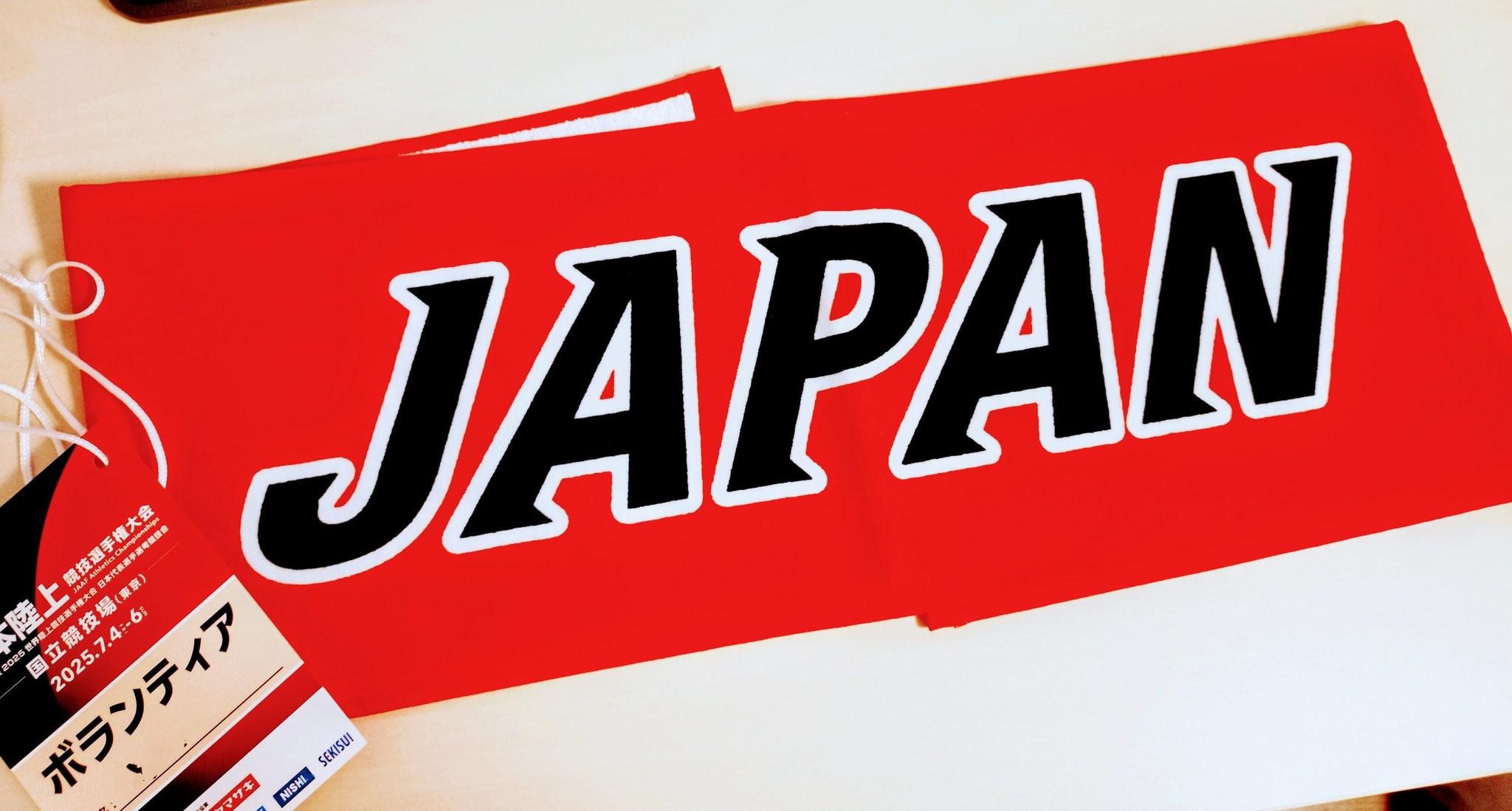 日本陸連SNSアカウントフォローで無料配布。結局暑いので大活躍。活動中・観戦中ずっとつけてました