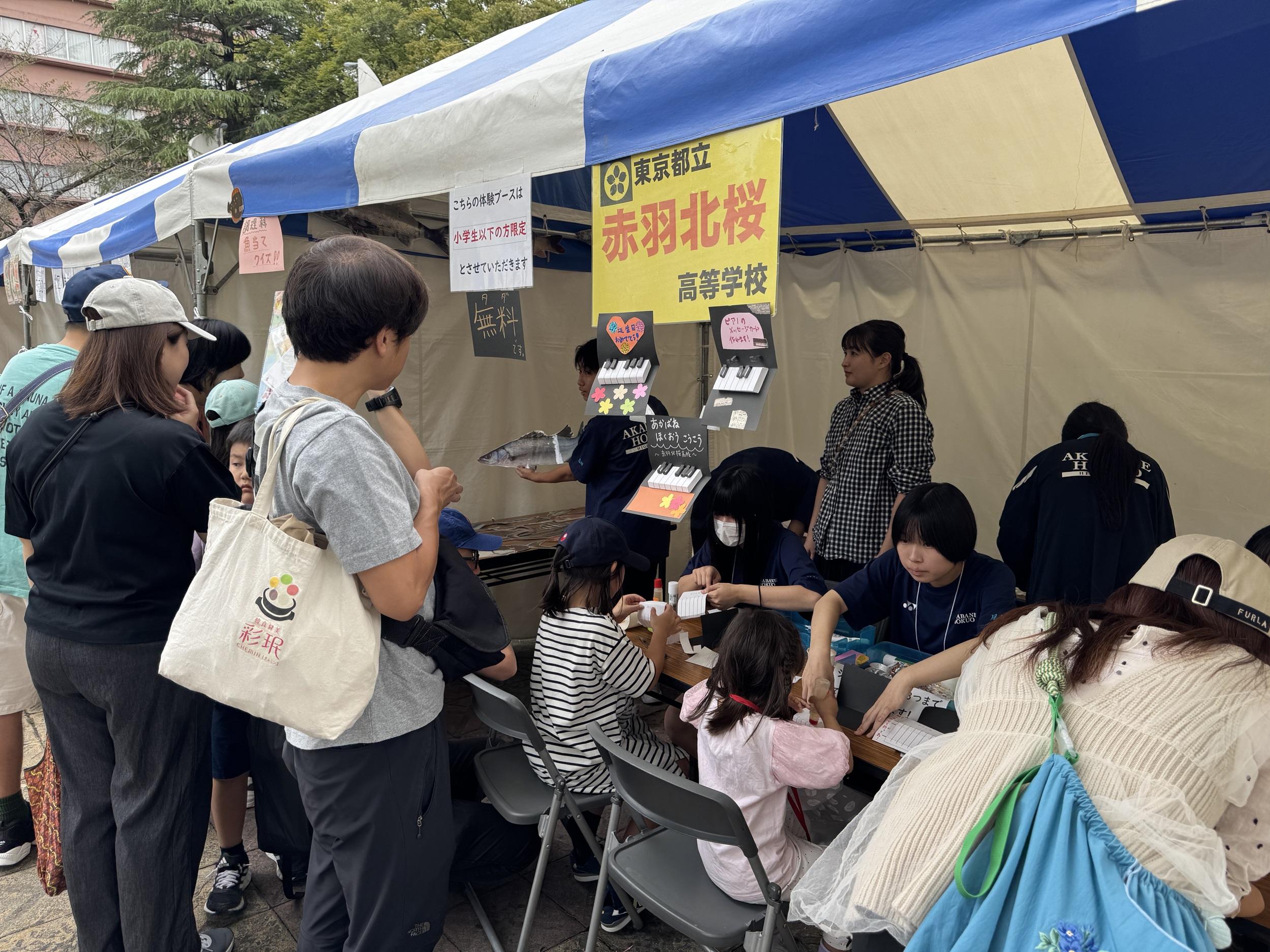 10月は、1年生の「人間と社会」の体験学習の一環で、ふるさと北区民まつりに1学年全員がボランティア活動を行いました。私達、社会福祉部は、赤羽会場の赤羽北桜高校ブースで、小学生以下の子供たちを対象に、造形体験(飛び出すカード作り)を行いました。このような活動は初めてで、当日も作業工程の確認をするなど行いましたが、様々な課題が浮き彫りとなりましたが、引率の先生方のアドバイスや仲間との助け合いで、臨機応変に対応することができ、とても充実した1日となりました。部活動の活動の中で、新たな取組を見付けることができました。子供たちの多くの笑顔を見ることができ、企画してよかった!と思う瞬間でもありました。