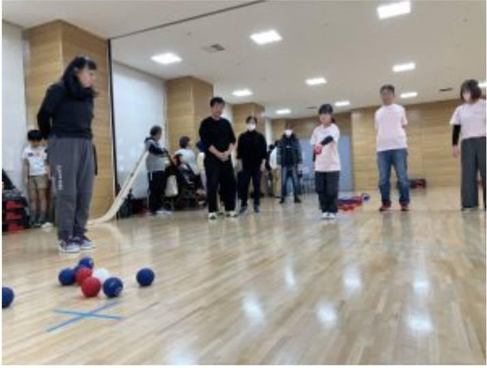 初めて参加してボッチャをする家族が居るので、言葉で「赤チーム、投げて下さい。」とか判り易くしました。