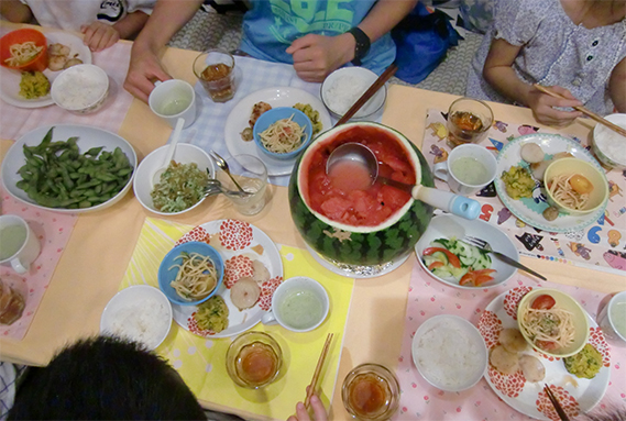 夏にはスイカをくりぬいて、フルーツポンチを作った