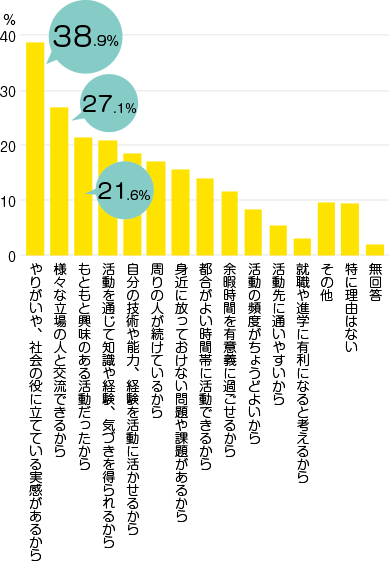 活動場所で出会う人とのふれあいが楽しいことや、日常生活では出会えないような人の意見を聞けるのが面白いため続けています。