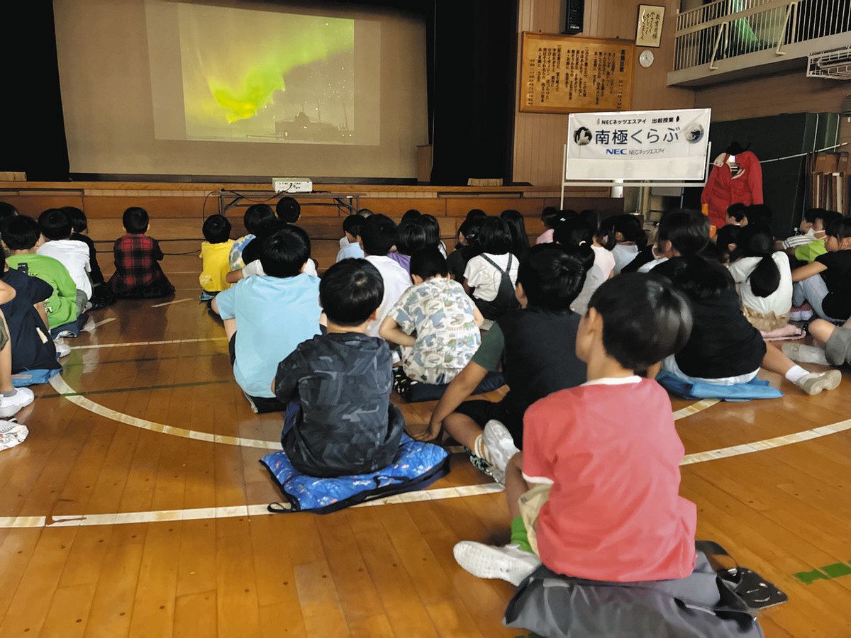 体育館に集まった児童を前に、落合さんはドローンによる空撮映像やオーロラの画像を見せながら「南極点はどこでしょうか」とクイズを交えて話した。子どもたちは南極の風景に歓声を上げ、越冬隊の赤い防寒着を試着した代表の児童は「暑い」「靴が重い」と驚いていた。